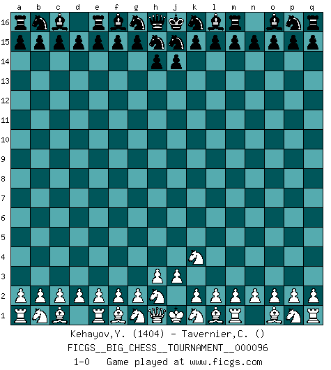 Last move : 1-0 2014 October 27 9:36:7 [Event "FICGS__BIG_CHESS__TOURNAMENT__000096"] [Site "FICGS"] [Date "2014.09.26"] [Round "1"] [White "Kehayov,Yulian"] [Black "Tavernier,Christopher"] [Result "1-0"] [WhiteElo "1404"] [BlackElo ""] 1.j2-k4 1-0 This big chess game has been lost on time (started : 2014.09.26 20:36:5) Follow this game move after move (download)Blessed be the memory of him who gave the world this immortal game. (A. G. Gardiner) Wenn man heute mit 14 Jahren noch kein GM ist, kann man es vergessen. (Viswanathan Anand) No es tiempo de jugar al Ajedrez cuando la casa esta en llamas. (Proverbio Italiano) Les ravages du H expliquent la différence de niveau entre Tal et Thal [Abergel]. He is a liar. I just don't know what the lie is yet. (Horatio Caine, C.S.I. Miami)