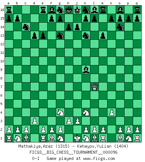 Last move : 0-1 2014 November 3 12:55:33 [Event "FICGS__BIG_CHESS__TOURNAMENT__000096"] [Site "FICGS"] [Date "2014.09.26"] [Round "1"] [White "Mathakiya,Azaz"] [Black "Kehayov,Yulian"] [Result "0-1"] [WhiteElo "1315"] [BlackElo "1404"] 1.j2-k4 h15-g13 2.h1-o7 p16-o14 3.o7-l7 j15-k13 4.l7-c15 b16-c14 5.c15-l7 e15-e13 6.h2-g4 m15-m13 7.d2-d3 d15-d13 8.n2-n4 c16-k9 0-1 Follow this game move after move (download)The combination player thinks forward; he starts from the given position, and tries the forceful moves in his mind. (Emanuel Lasker) Konzentriere dich auf materielle Gewinne. Nimm, was dir dein Gegner gibt, ausser es gibt einen guten Grund der dagegenspricht. (Robert James Fischer) Los libros de Ajedrez deben de usarse igual como usamos los anteojos: para mejorar la vista, aunque algunos jugadores los quieren usar como si ellos les otorgaran la vision. (José Raúl Capablanca) Pour se monter efficace, un Cavalier a besoin d'avant-postes ! Les Cavaliers font les meilleurs bloqueurs de pions passés. Employ the attack like tactic of defense. (Chinese proverb)