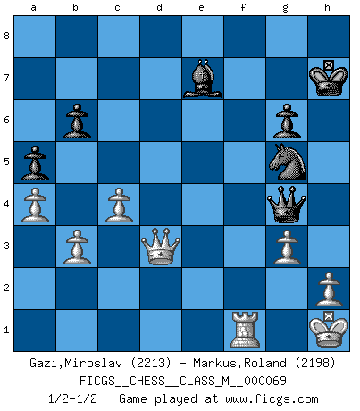 Last move : 1/2-1/2 2015 June 15 22:16:5 [Event "FICGS__CHESS__CLASS_M__000069"] [Site "FICGS"] [Date "2014.09.27"] [Round "1"] [White "Gazi,Miroslav"] [Black "Markus,Roland"] [Result "1/2-1/2"] [WhiteElo "2213"] [BlackElo "2198"] 1.d4 Nf6 2.Bg5 e6 3.Nd2 h6 4.Bh4 c5 5.e4 d5 6.exd5 Qxd5 7.dxc5 Nc6 8.Ngf3 g5 9.Bg3 g4 10.Nh4 Qxc5 11.Bd3 Bg7 12.Nb3 Qb6 13.a4 a5 14.Bb5 O-O 15.O-O Rd8 16.Qe2 Bd7 17.c3 h5 18.Kh1 Ne7 19.Nd4 Bxb5 20.Nxb5 Rd7 21.f3 Nc6 22.fxg4 hxg4 23.Ng6 Qd8 24.Bh4 fxg6 25.Qxe6+ Rf7 26.Bxf6 Bxf6 27.Nd6 Qe7 28.Rae1 Kg7 29.Nxf7 Qxf7 30.Qxg4 Re8 31.Rxe8 Qxe8 32.Rd1 Ne5 33.Qe4 Qc8 34.g3 b6 35.Rd5 Nf7 36.Kg2 Ng5 37.Qe2 Qh3+ 38.Kg1 Nf7 39.Rd2 Qf5 40.Kg2 Ng5 41.Qd3 Qh3+ 42.Kg1 Kh6 43.Re2 Kg7 44.Re3 Qg4 45.b3 Qh3 46.Qd5 Qg4 47.Kh1 Qh3 48.Re1 Kh6 49.Qd3 Kh7 50.c4 Qg4 51.Rf1 Be7 52.Qe3 Bc5 53.Qd3 Be7 1/2-1/2 Trompowsky attack (Ruth, Opovcensky Opening) Kingside Castling by player Black (move 14) Kingside Castling by player White (move 15) This chess game ended in a draw. Follow this game move after move (download)What is the object of playing a gambit opening?... To acquire a reputation of being a dashing player at the cost of losing a game. (Siegbert Tarrasch) Stil? Ich habe keinen Stil! (Anatoly Karpov) El Ajedrez tiene tanto misterio como las mujeres. (Purdy) La tactique est l'élément le plus important du milieu de jeu. (Siegbert Tarrasch) We need strong personalities and only one world champion to attract sponsors. (Anatoly Karpov)
