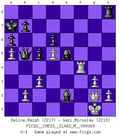 Last move : 0-1 2015 March 1 18:48:50 [Event "FICGS__CHESS__CLASS_M__000069"] [Site "FICGS"] [Date "2014.09.27"] [Round "1"] [White "Deline,Ralph"] [Black "Gazi,Miroslav"] [Result "0-1"] [WhiteElo "2217"] [BlackElo "2213"] 1.d4 f5 2.g3 Nf6 3.Bg2 g6 4.c3 Bg7 5.Nh3 Nc6 6.Nd2 O-O 7.O-O d6 8.d5 Ne5 9.Nf4 Bd7 10.Nf3 Qc8 11.Qb3 Nf7 12.Nd4 Nd8 13.a4 Kh8 14.Rd1 c5 15.Nf3 Ne4 16.Qc2 Rb8 17.Nh4 Kg8 18.Bxe4 fxe4 19.Qxe4 g5 20.Nhg6 hxg6 21.Nxg6 Bf6 22.Nxf8 Kxf8 23.f4 Bf5 24.Qc4 gxf4 25.Bxf4 Nf7 26.Rf1 Ke8 27.e4 Bh3 28.Rf2 Qd7 29.Qe2 Kd8 30.Qh5 Ne5 31.Bxe5 Bxe5 32.Rf7 Kc7 33.Rh7 Bg4 34.Qf7 Re8 35.Qf1 Qd8 36.a5 a6 37.Rf7 Bd7 38.Rf2 Kb8 39.Qe2 Rh8 40.Qe3 Qg8 41.Rd2 e6 42.Qf3 exd5 43.exd5 Bb5 44.Rf2 Bc4 45.Rd2 Qe8 46.Rf2 Ka7 47.Qg2 Bg7 48.Rf4 Qb5 49.Re1 Be5 50.Re2 Bxe2 0-1 Dutch defense Kingside Castling by player Black (move 6) Kingside Castling by player White (move 7) Player Black won this chess game. Follow this game move after move (download)There is only one thing Fischer does in Chess without pleasure: to lose ! (Boris Spassky) Ich habe Putins Aufstieg an die Macht beobachtet und seine Politik, die demokratischen Institutionen meines Landes zu zerstören. (Garry Kasparov) Mi estilo es algo parecido entre un poco de Tal y Petrosian. (Reshevsky) Ne tendez aucun piège pour le plaisir ! Ne jouez rien dans l'espoir que l'adversaire réagisse de façon stupide ! Prenez toujours pour acquis que l'adversaire va trouver le meilleur coup ! Ne jouez jamais de coup dans l'espoir que l'adversaire ne voie pas la menace ! Chacun de vos coups doit améliorer la position d'une façon ou d'une autre. It's not a bug - it's an undocumented feature. (Anonymous)
