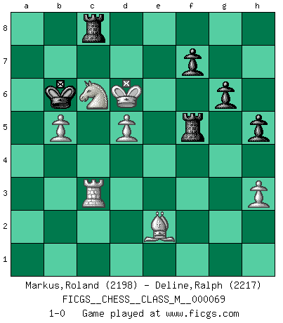 Last move : 1-0 2015 March 4 14:28:19 [Event "FICGS__CHESS__CLASS_M__000069"] [Site "FICGS"] [Date "2014.09.27"] [Round "1"] [White "Markus,Roland"] [Black "Deline,Ralph"] [Result "1-0"] [WhiteElo "2198"] [BlackElo "2217"] 1.Nf3 Nf6 2.d4 e6 3.c4 Bb4+ 4.Nbd2 O-O 5.a3 Be7 6.e4 d6 7.Bd3 e5 8.O-O exd4 9.Nxd4 Re8 10.f4 Nfd7 11.N2f3 Bf6 12.Be3 g6 13.Re1 b6 14.b4 Bb7 15.Rb1 Bg7 16.Bd2 Nc6 17.Ne2 a5 18.Bc3 Nf6 19.Qc2 Bh6 20.Nd2 axb4 21.axb4 Qe7 22.Qb2 Nh5 23.g3 Qd7 24.Rf1 Nd8 25.Rf3 Ne6 26.Rbf1 Neg7 27.Qb1 c5 28.b5 Qe6 29.Bb2 Nf6 30.Nc3 Qh3 31.R1f2 Ng4 32.Bf1 Qh5 33.Re2 Ne6 34.h3 Ne5 35.R3f2 Nd7 36.Nd5 Bg7 37.Bxg7 Kxg7 38.Qd3 Qh6 39.Nc7 Nxc7 40.Qxd6 Nf6 41.e5 Nh5 42.Qxc7 Nxg3 43.Qxb7 Nxe2+ 44.Rxe2 Qxf4 45.Rf2 Rab8 46.Qc7 Rbc8 47.Qxb6 Qxe5 48.Qb7 Rc7 49.Qd5 Qxd5 50.cxd5 Rd7 51.Bc4 Rd6 52.Kg2 Re7 53.Nb3 Ra7 54.Rc2 Kf6 55.Nxc5 Ke5 56.Nd3+ Kd4 57.Nb4 Rc7 58.Nc6+ Kc5 59.Kf3 Rf6+ 60.Ke4 Kb6 61.Be2 h5 62.Rc3 Rc8 63.Ke5 Rf5+ 64.Kd6 1-0 Reti Opening Kingside Castling by player Black (move 4) Kingside Castling by player White (move 8) Player White won this chess game. Follow this game move after move (download)Half the variations which are calculated in a tournament game turn out to be completely superfluous. Unfortunately, no one knows in advance which half. (Jan Tinman) Der 70jährige Viktor Kortschnoi: Die Rentenanstalt wollte mich zwingen in Rente zu gehen. Meine Frau erhält jetzt eine Pension- und ich zahle weiter in die Rentenkasse ein! (Viktor Kortschnoi) Tu sabes que vas a perder. Aún cuando tenía la ventaja, yo sabía que iba a perder. - al estar jugando con Fischer (Andrew Soltis) Toute estimation doit être constamment réévaluée. (Jacob Estrin) Yoga is 99% practice and 1% knowledge. (Sri Krishna Pattabhi Jois)