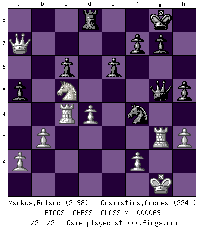 Last move : 1/2-1/2 2014 December 29 19:43:11 [Event "FICGS__CHESS__CLASS_M__000069"] [Site "FICGS"] [Date "2014.09.27"] [Round "1"] [White "Markus,Roland"] [Black "Grammatica,Andrea"] [Result "1/2-1/2"] [WhiteElo "2198"] [BlackElo "2241"] 1.e4 c5 2.c3 Nf6 3.e5 Nd5 4.d4 cxd4 5.Nf3 Nc6 6.cxd4 d6 7.Bc4 Nb6 8.Bb5 dxe5 9.Nxe5 Bd7 10.Nxd7 Qxd7 11.Nc3 Rd8 12.O-O e6 13.Be3 Be7 14.Qf3 O-O 15.Rfd1 a6 16.Bxc6 bxc6 17.Rac1 Nd5 18.Na4 Rb8 19.Qe2 Rb5 20.Rc4 Rd8 21.h3 h6 22.Bd2 Bd6 23.Qg4 h5 24.Qf3 Ne7 25.b3 Rf5 26.Qe2 a5 27.Rdc1 Bb8 28.Nc5 Qc7 29.g3 Ba7 30.Bf4 Rxf4 31.gxf4 Qxf4 32.Qe5 Qh4 33.Qc7 Ng6 34.Qxa7 Nf4 35.R1c3 Qg5+ 36.Rg3 1/2-1/2 Sicilian : Alapin's variation (2.c3) Kingside Castling by player White (move 12) Kingside Castling by player Black (move 14) This chess game ended in a draw. Follow this game move after move (download)Could we look into the head of a Chess player, we should see there a whole world of feelings, images, ideas, emotion and passion. (Alfred Binet) Ein Großmeister muß tausende Partien in seinem Kopf speichern, denn diese sind für Ihn, was die Worte der Muttersprache für gewöhnliche Leute sind, oder Noten für Musiker... (Garry Kasparov) El Ajedrez te enseña a controlarl la excitación inicial que sientes cuando vez algo que parece bueno y te enseña a pensar objetivamente cuando te encuentras en problemas. (Stanley Kubrick) Karpov est une pièce de musée. (Garry Kasparov) Always two there are. No more no less. A master, and an apprentice. (Master Yoda in Star Wars ep.1)