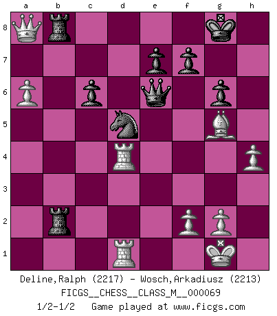 Last move : 1/2-1/2 2014 November 17 14:39:4 [Event "FICGS__CHESS__CLASS_M__000069"] [Site "FICGS"] [Date "2014.09.27"] [Round "1"] [White "Deline,Ralph"] [Black "Wosch,Arkadiusz"] [Result "1/2-1/2"] [WhiteElo "2217"] [BlackElo "2213"] 1.d4 Nf6 2.Nf3 g6 3.c4 Bg7 4.Nc3 d5 5.Bf4 O-O 6.Rc1 dxc4 7.e3 Be6 8.Ng5 Bd5 9.e4 h6 10.exd5 hxg5 11.Bxg5 Nxd5 12.Bxc4 Nb6 13.Bb3 Nc6 14.d5 Nd4 15.O-O Qd7 16.h4 Rfe8 17.a3 Nxb3 18.Qxb3 Rad8 19.Rfd1 Qf5 20.a4 Bxc3 21.Rxc3 Nxd5 22.Rf3 Qe4 23.Rfd3 c6 24.Rd4 Qe6 25.Qxb7 Rb8 26.Qxa7 Rxb2 27.a5 Reb8 28.a6 R8b6 29.Qa8+ Rb8 1/2-1/2 King's Indian : East Indian defense Kingside Castling by player Black (move 5) Kingside Castling by player White (move 15) This chess game ended in a draw. Follow this game move after move (download)The hallmark of the artist is simplicity. (Larry Evans) Das Schach ist nichts für kleine Geister, es beansprucht einen vollen Mann, der sich nicht sklavisch an das Überlieferte hält, sondern selbständig die Tiefen des Spiels zu ergründen sucht. (Wilhelm Steinitz) Cualquier cambio de material en una posición debe venir por medio de un mate, una captura o promoción de Peón. (Purdy) Le jeu d'échecs fait naître et fortifie en nous plusieurs qualités précieuses dans le cours de l'existence, telles que la prévoyance, la circonspection, la prudence, et la persévérance. (Benjamin Franklin - 1783, la morale des échecs) The intuitive mind is a sacred gift; the rational mind is a faithful servant. We have created a society that honors the servant but has forgotten the gift. (Albert Einstein)