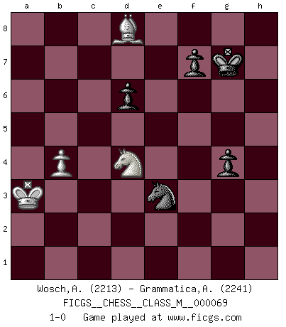 Last move : 1-0 2015 February 9 19:48:12 [Event "FICGS__CHESS__CLASS_M__000069"] [Site "FICGS"] [Date "2014.09.27"] [Round "1"] [White "Wosch,Arkadiusz"] [Black "Grammatica,Andrea"] [Result "1-0"] [WhiteElo "2213"] [BlackElo "2241"] 1.e4 c5 2.Nf3 d6 3.d4 cxd4 4.Nxd4 Nf6 5.Nc3 a6 6.Be3 e5 7.Nb3 Be6 8.f3 h5 9.Qd2 Nbd7 10.O-O-O Rc8 11.Kb1 Be7 12.g3 Qc7 13.Rg1 b5 14.Nd5 Bxd5 15.exd5 Bd8 16.f4 O-O 17.Bh3 Re8 18.Rge1 Ng4 19.c3 a5 20.Bg1 Bf6 21.a3 Ra8 22.Bf1 Reb8 23.Rc1 Qb7 24.Rc2 exf4 25.gxf4 b4 26.axb4 axb4 27.cxb4 Bd8 28.Re8+ Nf8 29.b5 Nf6 30.Re1 Ra4 31.Rc6 Qd7 32.h3 Ng6 33.Ra6 Rxf4 34.Ra7 Qc8 35.Bd3 Ne5 36.Qxf4 Nxd3 37.Re8+ Kh7 38.Qf1 Nxe8 39.Qxd3+ Kg8 40.Qf1 Rb7 41.b6 Bxb6 42.Bxb6 Nf6 43.Rxb7 Qxb7 44.Qg1 Kf8 45.Ka2 g5 46.Qd4 Kg7 47.Ka3 Qxd5 48.Qxd5 Nxd5 49.Bd8 g4 50.hxg4 hxg4 51.Nd4 Ne3 52.b4 1-0 Sicilian : Najdorf, Byrne (English) attack Queenside Castling by player White (move 10) Kingside Castling by player Black (move 16) 10 pieces endgame at move 50 : White KBNPP , Black KNPPP WHITE : King + 1 Bishop 1 Knight 2 Pawns BLACK : King + 1 Knight 3 Pawns 9 pieces endgame at move 50 : White KBNP , Black KNPPP WHITE : King + 1 Bishop 1 Knight 1 Pawn BLACK : King + 1 Knight 3 Pawns Player White won this chess game. Follow this game move after move (download)I prefer to lose a really good game than to win a bad one. (David Levy) Schach ist ein schwarz-weisser Dschungel. (Garry Kasparov) ¿Cual es el objetivo de jugar una apertura de gambito?... Para adquirir una reputación de ser un jugador apuesto a costo de perder el juego. (Siegbert Tarrasch) Il a essayé de se convaincre qu'il pourrait empêcher toutes les erreurs et ne jamais perdre. L'horreur ! Gary Kasparov au sujet de Robert Fischer. Difficult things take a long time, impossible things a little longer. (Author unknown)