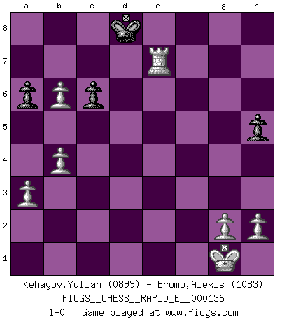 Last move : 1-0 2014 December 2 20:27:36 [Event "FICGS__CHESS__RAPID_E__000136"] [Site "FICGS"] [Date "2014.09.28"] [Round "1"] [White "Kehayov,Yulian"] [Black "Bromo,Alexis"] [Result "1-0"] [WhiteElo "0899"] [BlackElo "1083"] 1.e4 e5 2.Nf3 Nc6 3.d4 d6 4.dxe5 dxe5 5.Qxd8+ Kxd8 6.c4 Nf6 7.Be2 Be6 8.Nc3 Bb4 9.Bd2 Bxc3 10.Bxc3 Bg4 11.O-O Bxf3 12.Bxf3 a6 13.Rad1+ Nd7 14.b4 f6 15.Bg4 Ncb8 16.c5 c6 17.a3 Ke7 18.f4 h5 19.Be2 exf4 20.Rxf4 g6 21.Bc4 Rd8 22.Bxf6+ Nxf6 23.Rxd8 Kxd8 24.Rxf6 Nd7 25.Rxg6 Kc7 26.Rg7 Re8 27.Bd3 Kc8 28.Rh7 Nf6 29.Rf7 Nxe4 30.Bxe4 Rxe4 31.Rf8+ Kc7 32.Rf3 b6 33.Rf7+ Kd8 34.cxb6 Re7 35.Rxe7 1-0 Scotch Opening Kingside Castling by player White (move 11) Player White won this chess game. Follow this game move after move (download)The tactician knows what to do when there is something to do; whereas the strategian knows what to do when there is nothing to do. (Gerald Abrahams) Mit sehr nachdenklichem Gesicht schreitet Bobby durch den Turniersaal. Was ist passiert?, fragt Lombardy. Ich stehe schlecht, antwortet Fischer. Lombardy: Dann biete doch einfach Remis an. Fischer: So schlecht stehe ich nun auch wieder nicht! (Robert James Fischer) Un sacrificio se refuta mucho mejor al aceptarlo. (Wilhelm Steinitz) Les Echecs ont trois composantes : le temps, l'espace et le matériel en dernier. (Mikhail Tal) We cannot be sure of having something to live for unless we are willing to die for it. (Ernesto Che Guevara)