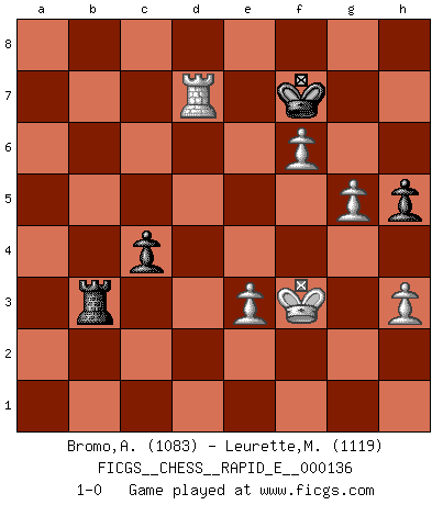 Last move : 1-0 2014 October 6 21:19:36 [Event "FICGS__CHESS__RAPID_E__000136"] [Site "FICGS"] [Date "2014.09.28"] [Round "1"] [White "Bromo,Alexis"] [Black "Leurette,Marc-Antoine"] [Result "1-0"] [WhiteElo "1083"] [BlackElo "1119"] 1.d4 d6 2.c4 e5 3.Nc3 exd4 4.Qxd4 Nc6 5.Qd1 Nf6 6.Bg5 Be7 7.Bxf6 Bxf6 8.h3 Bxc3+ 9.bxc3 O-O 10.Nf3 Be6 11.e3 Na5 12.a4 Bxc4 13.Bxc4 Nxc4 14.Qd5 Nb6 15.Qxb7 d5 16.Qc6 a5 17.O-O Re8 18.Nd4 Nc4 19.Qc5 Qd6 20.Qxd6 Nxd6 21.Rfe1 c5 22.Nb5 Nxb5 23.axb5 Reb8 24.Reb1 a4 25.f4 f5 26.Kf2 a3 27.Rb3 a2 28.Rb2 Ra5 29.Rbxa2 Raxb5 30.Ra5 h5 31.Kf3 g6 32.g4 Kg7 33.Ra7+ Kf6 34.R1a6+ R5b6 35.Rxb6+ Rxb6 36.g5+ Ke6 37.Rg7 Rb3 38.Rxg6+ Kf7 39.Rf6+ Ke7 40.Rxf5 Rxc3 41.Rxd5 c4 42.f5 Rb3 43.f6+ Kf7 44.Rd7+ 1-0 Old Indian defense Kingside Castling by player Black (move 9) Kingside Castling by player White (move 17) 10 pieces endgame at move 41 : White KRPPPP , Black KRPP WHITE : King + 1 Rook 4 Pawns BLACK : King + 1 Rook 2 Pawns Player White won this chess game. Follow this game move after move (download)Only sissies Castle. (Rob Sillars) Ich könnte leicht behaupten: Ja,ja, Leonid Breschnew wollte nicht, daß ich Weltmeister werde. In der Tat war die Sache komplizierter. (Viktor Kortschnoi) Debemos de asegurarnos de que el Ajedrez no se convierta en un lenguaje muerto, muy interesante, pero tan solo para un grupo muy pequeño. (Sytze Faber) Si le désir cupide (et stupide) de gagner est une inépuisable source de souffrance, une combinaison brillante sur l'échiquier est une découverte : le coquelicot qui s'épanouit lorsque apparaît la Voie Lactée. (Arrabal) Gambling is the son of avarice and the father of despair. (French proverb)