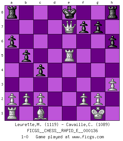 Last move : 1-0 2014 September 30 22:22:23 [Event "FICGS__CHESS__RAPID_E__000136"] [Site "FICGS"] [Date "2014.09.28"] [Round "1"] [White "Leurette,Marc-Antoine"] [Black "Cavaille,Cedric"] [Result "1-0"] [WhiteElo "1119"] [BlackElo "1089"] 1.e4 e5 2.Nf3 d6 3.h3 Nf6 4.Nc3 a6 5.Bc4 b5 6.Bb3 h6 7.O-O Be7 8.d4 exd4 9.Nxd4 c5 10.Nf5 Bxf5 11.Bd5 Nxd5 12.Qxd5 Bxe4 13.Nxe4 Nd7 14.Nxd6+ Bxd6 15.Qxd6 c4 16.Re1+ Ne5 17.Rxe5+ Qe7 18.Qxe7+ 1-0 Philidor's defense Kingside Castling by player White (move 7) Player White won this chess game. Follow this game move after move (download)Chess holds its master in its own bonds, shackling the mind and brain so that the inner freedom of the very strongest must suffer. (Albert Einstein) Die größte Kunst beim Schach besteht darin dem Gegner nicht zu zeigen was er tun kann. (Garry Kasparov) Cuando veas una buena jugada, trata de encontrar otra mejor. (Emanuel Lasker) Le jeu d'échecs est comme rejeté hors du temps. (Antoine de Saint-Exupéry) If you lose the game you should win the analysis! (Proverb)