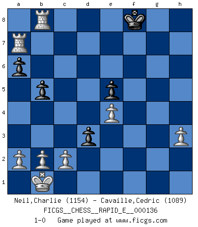 Last move : 1-0 2014 November 1 16:57:25 [Event "FICGS__CHESS__RAPID_E__000136"] [Site "FICGS"] [Date "2014.09.28"] [Round "1"] [White "Neil,Charlie"] [Black "Cavaille,Cedric"] [Result "1-0"] [WhiteElo "1154"] [BlackElo "1089"] 1.e4 e5 2.Nf3 d6 3.Nc3 Bg4 4.Bc4 Nf6 5.h3 Bxf3 6.Qxf3 Be7 7.d3 O-O 8.Be3 Re8 9.O-O-O Nc6 10.g4 Nd4 11.Qg3 g6 12.Kb1 Bf8 13.Rdf1 a6 14.f4 b5 15.Bd5 Nxd5 16.Nxd5 c6 17.fxe5 dxe5 18.Nf6+ Kg7 19.Qh4 h5 20.Nxe8+ Qxe8 21.Qf6+ Kg8 22.gxh5 Qe7 23.hxg6 Qxf6 24.Rxf6 fxg6 25.Rxg6+ Bg7 26.Rhg1 Ra7 27.Bh6 Re7 28.Bxg7 Ne6 29.Bf6 Rg7 30.Bxg7 Nxg7 31.Rxg7+ Kf8 32.R1g6 c5 33.Ra7 c4 34.Rb6 cxd3 35.Rb8+ 1-0 Philidor's defense Kingside Castling by player Black (move 7) Queenside Castling by player White (move 9) Player White won this chess game. Follow this game move after move (download)You cannot play at Chess if you are kind-hearted. (French Proverb) Ich spiele ehrlich und spiele, um zu gewinnen. Wenn ich verliere nehme ich meine Medizin. (Robert James Fischer) Fischer sacrificó virtualmente todo lo que la mayoría de nosotros los 'debiles' (término que él usa) valoramos, respetamos y apreciamos por el amor de un astuto, a menudo hermoso tablero de juego, por el privilegio ambivalente de ser su mas grande maestro. (Paul Kollar) Vous m'avez demandé de vous exposer quel est le fondement de la prière. Je ne fais que préparer les pièces du jeu sur la table... Nous sera-t-il permis d'en adopter les règles et si nous les appliquons scrupuleusement nous ne tarderons pas à faire mat le Roi divin ! Il ne pourra échapper à nos mains. (Sainte Thérèse d'Avila, Chemin de perfection) Children in the dark cause accidents, accidents in the dark cause children. (Unknown)