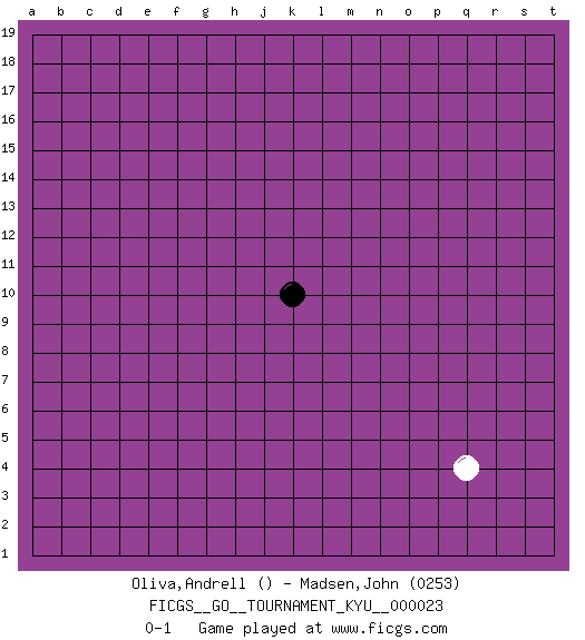 Last move : 0-1 2007 March 25 9:12:7 [Event "FICGS__GO__TOURNAMENT_KYU__000023"] [Site "FICGS"] [Date "2007.02.21"] [Round "1"] [Black "Oliva,Andrell"] [White "Madsen,John"] [Result "0-1"] [Rating 2 "0253"] 1.k10 q4 0-1 This go game has been lost on time (started : 2007.02.21 18:12:29) Here are the names of the openings (joseki) played in the four corners : Corner q4 : q4 0-1 Hoshi (Hwajeom, Seongjeom, Xingwei`) 4-4 Point. The star or hoshi (4-4) point, emphasizing influence at the potential expense of territory. Player White won this Go (weiqi, baduk) game. Follow this game move after move (download)Go is to western chess what philosophy is to double entry accounting. (from Shibumi, by Trevanian) A journey of a thousand sites begins with a single click. (Author unknown)