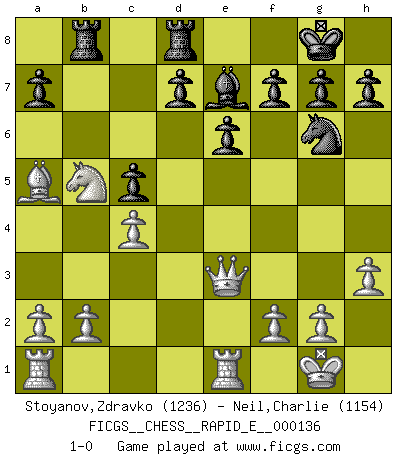 Last move : 1-0 2014 November 1 23:17:0 [Event "FICGS__CHESS__RAPID_E__000136"] [Site "FICGS"] [Date "2014.09.28"] [Round "1"] [White "Stoyanov,Zdravko"] [Black "Neil,Charlie"] [Result "1-0"] [WhiteElo "1236"] [BlackElo "1154"] 1.e4 e6 2.Nf3 c5 3.h3 Nc6 4.Bb5 Nge7 5.d3 Ng6 6.Bxc6 bxc6 7.e5 Qc7 8.d4 cxd4 9.Qxd4 c5 10.Qe4 Bb7 11.Qe2 Be7 12.O-O Bxf3 13.Qxf3 O-O 14.Re1 Rab8 15.c4 Rfd8 16.Nc3 Nxe5 17.Qe4 Ng6 18.Nb5 Qa5 19.Qe3 Nf4 20.Bd2 Ng6 21.Bxa5 1-0 French defense Kingside Castling by player White (move 12) Kingside Castling by player Black (move 13) Player White won this chess game. Follow this game move after move (download)A good sacrifice is one that is not necessarily sound but leaves your opponent dazed and confused. (Rudolph Spielmann) Ein Buch ist ein Spiegel; wenn ein Affe hineinsieht, so kann kein Apostel heraus gucken. (Georg Christoph Lichtenberg) Un jugador que es sorprendido, esta derrotado a medias. (Proverbio) La guerre est enfant de la passion, la passion est enfant du narcissisme et le narcissisme est l'enfant. (...) Une autre partie ? (Thibault de Vassal) A good player is always lucky. (Capablanca)