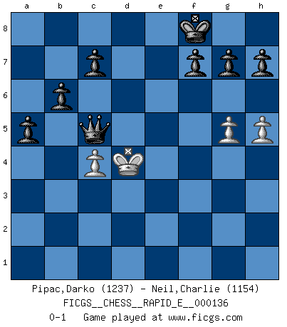 Last move : 0-1 2014 November 21 9:40:9 [Event "FICGS__CHESS__RAPID_E__000136"] [Site "FICGS"] [Date "2014.09.28"] [Round "1"] [White "Pipac,Darko"] [Black "Neil,Charlie"] [Result "0-1"] [WhiteElo "1237"] [BlackElo "1154"] 1.e4 e5 2.d4 exd4 3.c3 d3 4.Nf3 Nc6 5.Qxd3 Bc5 6.e5 Nge7 7.Nbd2 Ng6 8.Nc4 O-O 9.Bg5 Be7 10.Bxe7 Qxe7 11.O-O-O Ncxe5 12.Ncxe5 Nxe5 13.Nxe5 Qxe5 14.Be2 d6 15.g3 Bf5 16.Qc4 Rac8 17.Rhe1 Qf6 18.Rd2 Rfe8 19.h4 Re4 20.Qd5 b6 21.f3 Re7 22.Kd1 Rce8 23.g4 Be6 24.Qc6 Bxa2 25.Qa4 Be6 26.g5 Qg6 27.Bd3 Qh5 28.Be4 Kf8 29.Rde2 d5 30.Bd3 Qxf3 31.Kd2 a5 32.Qb5 Qf4+ 33.Kd1 Bg4 34.Qxd5 Bxe2+ 35.Rxe2 Qa4+ 36.Kd2 Qf4+ 37.Kd1 Qf1+ 38.Kd2 Rxe2+ 39.Bxe2 Rxe2+ 40.Kd3 Re5 41.Kd4 Rxd5+ 42.Kxd5 Qb5+ 43.Kd4 Qxb2 44.h5 Qb5 45.c4 Qc5+ 0-1 Danish gambit Kingside Castling by player Black (move 8) Queenside Castling by player White (move 11) Player Black won this chess game. Follow this game move after move (download)Discovered check is the dive bomber of the Chessboard. (Reuben Fine) Man kann eine Schachpartie nur gewinnen, wenn das Gleichgewicht gestört ist. In einer Stellung mit ungestörtem Gleichgewicht ist auch das größte Genie hilflos - in der Stellung steckt dann eben kein genialer Einfall. (Wilhelm Steinitz) Realmente no sabemos como el juego fue inventado, aunque hay sospechas. Tan pronto como descubramos a los culpables, se los haremos saber. (Bruce Pandolfini) Lorsque vous vous retrouvez devant une position atroce, ne tendez pas un ultime piège dérisoire avec l'intention d'abandonner si l'adversaire le déjoue ! Faites-vous plutôt un devoir de résister comme si votre vie en dépendait. Jouez le coup qui vous déplairait au centuple si vous étiez dans la peau de votre tortionnaire ! There's always a bigger fish. (Qui-Gon Jinn in Star Wars ep.1)