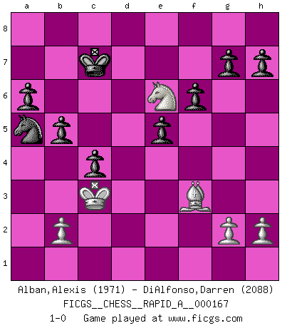 Last move : 1-0 2014 December 20 19:41:40 [Event "FICGS__CHESS__RAPID_A__000167"] [Site "FICGS"] [Date "2014.10.04"] [Round "1"] [White "Alban,Alexis"] [Black "DiAlfonso,Darren"] [Result "1-0"] [WhiteElo "1971"] [BlackElo "2088"] 1.d4 d5 2.c4 c6 3.Nf3 Nf6 4.Nc3 dxc4 5.a4 Bf5 6.Ne5 e6 7.f3 Bb4 8.e4 Bxe4 9.fxe4 Nxe4 10.Bd2 Qxd4 11.Nxe4 Qxe4+ 12.Qe2 Bxd2+ 13.Kxd2 Qd5+ 14.Kc2 Na6 15.Re1 Qa5 16.Kb1 O-O 17.Qe4 Nc5 18.Qe3 Nb3 19.Qc3 b5 20.Qxa5 Nxa5 21.Rd1 Rfd8 22.Nd7 f6 23.Be2 Kf7 24.Rhe1 Ke7 25.Nc5 e5 26.axb5 cxb5 27.Bf3 Rxd1+ 28.Rxd1 Rd8 29.Rxd8 Kxd8 30.Kc2 a6 31.Kc3 Kc7 32.Ne6+ 1-0 QGD Slav : Wiesbaden variation Kingside Castling by player Black (move 16) Player White won this chess game. Follow this game move after move (download)There are two classes of men; those who are content to yield to circumstances and who play whist; those who aim to control circumstances, and who play Chess. (Mortimer Collins) Du musst nicht gut spielen, es reicht, wenn du besser spielst als dein Gegner. (Anonymous) El Ajedrez por encima de todo... ¡es una pelea!. (Emanuel Lasker) Les Echecs ne sont pas pour les âmes timides. Ils requièrent un homme entier, qui ne s'arrête pas aveuglément à ce qui a été déjà établi, mais qui tente individuellement de sonder les profondeurs du jeu. (W. Steinitz) I believe in luck. How else can you explain the success of those you dislike ? (Jean Cocteau)