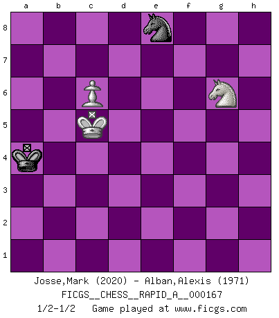 Last move : 1/2-1/2 2015 February 1 23:6:30 [Event "FICGS__CHESS__RAPID_A__000167"] [Site "FICGS"] [Date "2014.10.04"] [Round "1"] [White "Josse,Mark"] [Black "Alban,Alexis"] [Result "1/2-1/2"] [WhiteElo "2020"] [BlackElo "1971"] 1.e4 c5 2.Nf3 d6 3.d4 cxd4 4.Nxd4 Nf6 5.Nc3 a6 6.Be3 e5 7.Nb3 Be6 8.f3 h5 9.Qd2 Nbd7 10.O-O-O Be7 11.Kb1 O-O 12.h3 h4 13.Bg5 b5 14.Bxh4 Nxe4 15.fxe4 Bxh4 16.Qxd6 Re8 17.Be2 Be7 18.Qc6 Qc8 19.Qxc8 Raxc8 20.Nd5 Nf6 21.Nxe7+ Rxe7 22.Bf3 Rec7 23.Rd2 b4 24.Rhd1 Kf8 25.Nc1 Nd7 26.Nd3 a5 27.Nf2 a4 28.Ng4 b3 29.cxb3 axb3 30.a3 f5 31.Ne3 f4 32.Nd5 Rc2 33.Nb4 Rxd2 34.Rxd2 Nb6 35.Rd3 Bf7 36.h4 Ke7 37.Bg4 Rc5 38.Bd1 Bg6 39.Bf3 Bf7 40.Bd1 Bg6 41.Rxb3 Bxe4+ 42.Bc2 Bxc2+ 43.Nxc2 Nc4 44.Rc3 Nd2+ 45.Kc1 Rxc3 46.bxc3 Ne4 47.Kb2 Kd6 48.a4 Nd2 49.Na3 Kc5 50.Nb1 Nf1 51.Kc2 e4 52.Nd2 Ne3+ 53.Kb3 Nxg2 54.Nxe4+ Kd5 55.Ng5 Nxh4 56.c4+ Kd6 57.Kc3 Kc5 58.Ne6+ Kb6 59.Nxf4 g6 60.Nd5+ Ka6 61.Ne7 Nf3 62.Nxg6 Ka5 63.c5 Ng5 64.Kc4 Ne4 65.c6 Nf6 66.Kd4 Ne8 67.Kc5 Kxa4 1/2-1/2 Sicilian : Najdorf, Byrne (English) attack Queenside Castling by player White (move 10) Kingside Castling by player Black (move 11) 10 pieces endgame at move 53 : White KNPPP , Black KNPPP WHITE : King + 1 Knight 3 Pawns BLACK : King + 1 Knight 3 Pawns 9 pieces endgame at move 54 : White KNPPP , Black KNPP WHITE : King + 1 Knight 3 Pawns BLACK : King + 1 Knight 2 Pawns 8 pieces endgame at move 55 : White KNPP , Black KNPP WHITE : King + 1 Knight 2 Pawns BLACK : King + 1 Knight 2 Pawns 7 pieces endgame at move 59 : White KNPP , Black KNP WHITE : King + 1 Knight 2 Pawns BLACK : King + 1 Knight 1 Pawn 6 pieces endgame at move 62 : White KNPP , Black KN WHITE : King + 1 Knight 2 Pawns BLACK : King + 1 Knight 5 pieces endgame at move 67 : White KNP , Black KN WHITE : King + 1 Knight 1 Pawn BLACK : King + 1 Knight This chess game ended in a draw. Follow this game move after move (download)Up to this point White has been following well-known analysis. But now he makes a fatal error: he begins to use his own head. (Siegbert Tarrasch) Frage des Reporters: -Worin besteht das Ziel von Gambiteröffnungen? Antwort: -Auf Kosten der Partie einen Ruf als Angriffspieler zu erwerben.- (Siegbert Tarrasch) Un Peón pasado aumenta su poder a medida de que el número de piezas en el tablero disminuye. (Capablanca) Comme les marins qui ont mille raisons différentes d'aller en mer, les joueurs d'échecs en ont tout autant avant de s'installer devant une table et jouer... (Vincent Bertignac, philosophe) Tomorrow's what you make of it. (Horatio Caine, C.S.I. Miami)