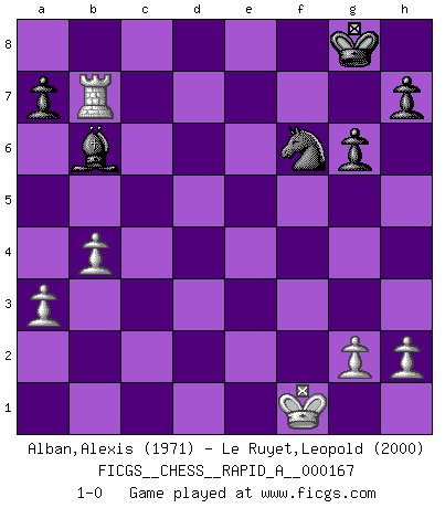 Last move : 1-0 2015 February 17 19:44:16 [Event "FICGS__CHESS__RAPID_A__000167"] [Site "FICGS"] [Date "2014.10.04"] [Round "1"] [White "Alban,Alexis"] [Black "Le Ruyet,Leopold"] [Result "1-0"] [WhiteElo "1971"] [BlackElo "2000"] 1.d4 Nf6 2.c4 e6 3.Nf3 c5 4.d5 d6 5.Nc3 exd5 6.cxd5 g6 7.Bf4 Bg7 8.Qa4+ Bd7 9.Qb3 Qc7 10.e4 O-O 11.Nd2 Nh5 12.Be3 f5 13.exf5 Bxf5 14.Be2 Nf6 15.O-O Na6 16.a3 Qd7 17.Rac1 Nc7 18.Qxb7 Ncxd5 19.Qxd7 Bxd7 20.Bc4 Be6 21.Nb5 Rad8 22.Rfe1 Bf7 23.Nxd6 Nxe3 24.Bxf7+ Rxf7 25.Nxf7 Rxd2 26.Ng5 Nc2 27.Nf3 Nxe1 28.Nxd2 Nd3 29.Rc3 Nxf2 30.Rxc5 N2e4 31.Nxe4 Nxe4 32.Rc8+ Kf7 33.Rc7+ Kg8 34.b4 Bd4+ 35.Kf1 Bb6 36.Rd7 Nf6 37.Rb7 1-0 This chess game has been lost on time (started : 2014.10.04 8:29:27) Queen's pawn game Kingside Castling by player Black (move 10) Kingside Castling by player White (move 15) Player White won this chess game. Follow this game move after move (download)Dazzling combinations are for the many, shifting wood is for the few. (Georg Kieninger) Auf Remis zu spielen ist gewissermaßen ein Verbrechen gegen das Schachspiel. (Mikhail Nekhemyevich Tal) Solo puedes ser bueno en el Ajedrez si amas al juego. (Bobby Fischer) Si le désir cupide (et stupide) de gagner est une inépuisable source de souffrance, une combinaison brillante sur l'échiquier est une découverte : le coquelicot qui s'épanouit lorsque apparaît la Voie Lactée. (Arrabal) Once you start thinking you have nothing left to learn, you have everything to learn. (Steve Badget)