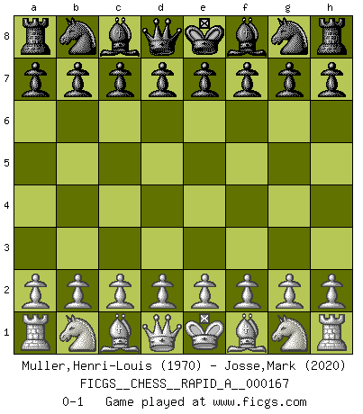Last move : 0-1 2014 November 3 10:12:58 [Event "FICGS__CHESS__RAPID_A__000167"] [Site "FICGS"] [Date "2014.10.04"] [Round "1"] [White "Muller,Henri-Louis"] [Black "Josse,Mark"] [Result "0-1"] [WhiteElo "1970"] [BlackElo "2020"] 0-1 This chess game has been lost on time (started : 2014.10.04 8:29:27) Player Black won this chess game. Follow this game move after move (download)Everything is in a state of flux, and this includes the world of Chess. (Mikhail Botvinnik) Ich spiele 70 Eröffnungssysteme. (Viktor Kortschnoi) ¿Esta Bobby Fischer algo cuerdo?. (Salo Flohr) Les pièces de l'échiquier étaient impitoyables. Elles le retenaient, elles l'absorbaient. Il y avait de l'horreur en cela, mais aussi une harmonie unique. Car, qu'y a-t-il dans le monde, à part les échecs ? (V. Nabokov) Better than a thousand days of diligent study is one day with a great teacher. (Japanese proverb)