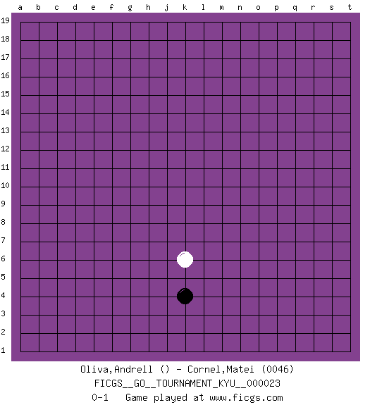Last move : 0-1 2007 March 25 9:12:7 [Event "FICGS__GO__TOURNAMENT_KYU__000023"] [Site "FICGS"] [Date "2007.02.21"] [Round "1"] [Black "Oliva,Andrell"] [White "Cornel,Matei"] [Result "0-1"] [Rating 2 "0046"] 1.k4 k6 0-1 This go game has been lost on time (started : 2007.02.21 18:12:29) Here are the names of the openings (joseki) played in the four corners : Player White won this Go (weiqi, baduk) game. Follow this game move after move (download)In the corner, five stones in a row on the third line are alive. (Anonymous) The mind is like a parachute, it only functions when its open. (Unknown)