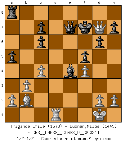 Last move : 1/2-1/2 2014 November 11 9:47:16 [Event "FICGS__CHESS__CLASS_D__000211"] [Site "FICGS"] [Date "2014.10.11"] [Round "1"] [White "Trigance,Emile"] [Black "Budnar,Milos"] [Result "1/2-1/2"] [WhiteElo "1573"] [BlackElo "1449"] 1.e4 e5 2.Nf3 Nc6 3.Bb5 Nf6 4.O-O Bd6 5.Nc3 O-O 6.d4 exd4 7.Nxd4 Be5 8.Bxc6 bxc6 9.f4 Bxd4 10.Qxd4 d5 11.exd5 Nxd5 12.Nxd5 Qxd5 13.Qf2 Bf5 14.Be3 a5 15.Rfd1 Qb5 16.b3 Be4 17.c4 Qh5 18.Rd4 Rfe8 19.Rad1 g6 20.Bc1 Qc5 21.Be3 Qe7 22.Rd7 Qe6 23.Bc1 Re7 24.Rxe7 Qxe7 25.Qd4 f5 26.Bb2 Kf7 27.Qg7+ 1/2-1/2 Ruy Lopez : Berlin defense, 4.O-O Kingside Castling by player White (move 4) Kingside Castling by player Black (move 5) This chess game ended in a draw. Follow this game move after move (download)Chess teaches you to control the initial excitement you feel when you see something that looks good and it trains you to think objectively when you're in trouble. (Stanley Kubrick) Mutter, ich bin eben Ex-Weltmeister geworden. --beim nach Hause Kommen nach dem Verlust des WM-Titels an Mihail Botvinnik -- (Mikhail Nekhemyevich Tal) Hay dos clases de hombres: aquellos que se conforman en dejarse llevar por las circunstancias y que juegan barajas y aquellos decididos a controlar las circunstancias y que juegan al Ajedrez. (Mortimer Collins) Roi des jeux et jeu des rois, les échecs portent en eux un sentiment d'infini. Ils donnent à celui qui s'est efforcé d'en approfondir les arcanes l'impression de n'être pas à la mesure de l'homme; en fait, ils constituent un résumé de l'univers, un microcosme, et figurent cette grande échelle qui, dans les plans de la lumière descend jusqu'à la matière, qui des abîmes insondables remonte jusqu'en l'infini de Dieu. (Pyrame) Convictions are more dangerous enemies of truth than lies. (Friedrich Nietzsche)