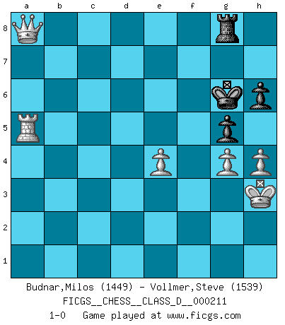 Last move : 1-0 2014 December 15 10:14:14 [Event "FICGS__CHESS__CLASS_D__000211"] [Site "FICGS"] [Date "2014.10.11"] [Round "1"] [White "Budnar,Milos"] [Black "Vollmer,Steve"] [Result "1-0"] [WhiteElo "1449"] [BlackElo "1539"] 1.e4 Nf6 2.e5 Nd5 3.d4 Nb6 4.Nf3 d6 5.a4 a5 6.Nc3 Nc6 7.Bb5 Bd7 8.exd6 exd6 9.O-O Be7 10.Bxc6 Bxc6 11.b3 O-O 12.d5 Bd7 13.Be3 c5 14.h3 f5 15.Qd2 Qc7 16.Bf4 Bf6 17.Rad1 c4 18.Nd4 Rfe8 19.Ncb5 Bxb5 20.Nxb5 Qd7 21.Nxd6 c3 22.Qd3 Red8 23.Nxf5 Qxd5 24.Qxd5 Rxd5 25.Rxd5 Nxd5 26.Bd6 Re8 27.Rd1 Nb4 28.Bxb4 axb4 29.Kf1 Bg5 30.Rd7 g6 31.Ne3 Rd8 32.Rxb7 Bxe3 33.fxe3 Rd1+ 34.Ke2 Rd2+ 35.Kf3 Rxc2 36.Rxb4 Rc1 37.Rc4 c2 38.Ke4 Rb1 39.Rxc2 Rxb3 40.Ra2 Kg7 41.a5 Rb4+ 42.Kf3 Kh6 43.a6 Rb8 44.a7 Ra8 45.e4 Kg5 46.Kg3 Kh5 47.Ra5+ g5 48.h4 h6 49.Kh3 Rg8 50.g4+ Kg6 51.a8=Q 1-0 Alekhine's defense Kingside Castling by player White (move 9) Kingside Castling by player Black (move 11) 10 pieces endgame at move 39 : White KRPPPP , Black KRPP WHITE : King + 1 Rook 4 Pawns BLACK : King + 1 Rook 2 Pawns Promotion Queen by player White (move 51) Player White won this chess game. Follow this game move after move (download)Many Chess players were surprised when after the game, Fischer quietly explained: 'I had already analyzed this possibility' in a position which I thought was not possible to foresee from the opening. (Mikhail Tal) Die größte Kunst beim Schach besteht darin dem Gegner nicht zu zeigen was er tun kann. (Garry Kasparov) No nos podemos resistir a la fascinación de un sacrificio ya que la pasión por los sacrificios es parte de la naturaleza de un jugador de Ajedrez. (Rudolf Spielman) Les pièces de l'échiquier étaient impitoyables. Elles le retenaient, elles l'absorbaient. Il y avait de l'horreur en cela, mais aussi une harmonie unique. Car, qu'y a-t-il dans le monde, à part les échecs ? (V. Nabokov) Life is the sum of all your choices. (Albert Camus)