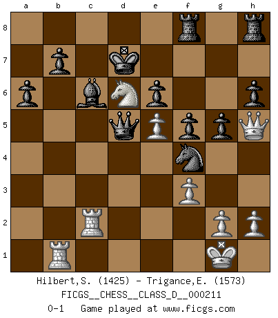 Last move : 0-1 2014 December 1 2:26:26 [Event "FICGS__CHESS__CLASS_D__000211"] [Site "FICGS"] [Date "2014.10.11"] [Round "1"] [White "Hilbert,Stephan J."] [Black "Trigance,Emile"] [Result "0-1"] [WhiteElo "1425"] [BlackElo "1573"] 1.e4 c5 2.b4 cxb4 3.a3 e6 4.axb4 Bxb4 5.c3 Be7 6.d4 d5 7.e5 Bd7 8.Bd3 Nc6 9.Qg4 g6 10.Nf3 Qb6 11.O-O O-O-O 12.Ng5 f5 13.Qd1 Rf8 14.Ba3 h6 15.Bxe7 Ngxe7 16.Nf3 g5 17.Na3 a6 18.c4 Nxd4 19.cxd5 Nxf3+ 20.Qxf3 Nxd5 21.Rfc1+ Bc6 22.Nc4 Qd4 23.Nd6+ Kd7 24.Rab1 Nb4 25.Qh5 Nxd3 26.Rc2 Qd5 27.f3 Nf4 0-1 Sicilian : wing gambit, Marshall variation Kingside Castling by player White (move 11) Queenside Castling by player Black (move 11) Player Black won this chess game. Follow this game move after move (download)Fischer is an American Chess tragedy on par with Morphy and Pillsbury. (Mig Greengard) Was ist der Unterschied zwischen einem Strassenarbeiter und einem Schachspieler? --Der Schachspieler bewegt sich ab und zu. (Anonymous) Todo se encuentra en un estado de flujo y esto incluye al mundo del Ajedrez. (Mikhail Botvinnik) C'est la seule position que je connaisse où les deux camps sont mals. Propos prêtés à V. Anand. Somehow our devils are never quite what we expect when we meet them face to face. (Nelson DeMille)