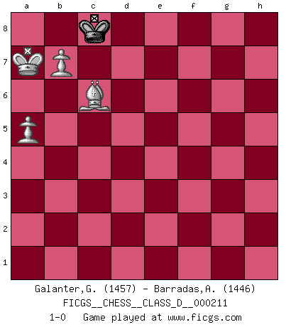 Last move : 1-0 2014 December 18 18:40:3 [Event "FICGS__CHESS__CLASS_D__000211"] [Site "FICGS"] [Date "2014.10.11"] [Round "1"] [White "Galanter,Gregory"] [Black "Barradas,Anderson"] [Result "1-0"] [WhiteElo "1457"] [BlackElo "1446"] 1.e4 e5 2.Nf3 Nc6 3.g3 Bc5 4.Bg2 d6 5.O-O Nf6 6.d3 h6 7.c3 Bg4 8.h3 Bxf3 9.Qxf3 Qe7 10.Nd2 a6 11.a4 a5 12.Nc4 O-O 13.Be3 Nd7 14.Qe2 Bxe3 15.fxe3 Nf6 16.Rf5 Qe6 17.Raf1 Nh7 18.Qf2 Ng5 19.h4 Nh7 20.Kh2 Ne7 21.Rf3 d5 22.exd5 Nxd5 23.Nxe5 Qxe5 24.Rf5 Qxf5 25.Qxf5 Nxe3 26.Qd7 Nxf1+ 27.Bxf1 Rac8 28.Bh3 Nf6 29.Qxc8 Rxc8 30.Bxc8 b6 31.Kg2 Ne8 32.g4 Nd6 33.Ba6 f5 34.Kf3 fxg4+ 35.Kxg4 g6 36.Kf4 Kf7 37.d4 Kf6 38.Bd3 g5+ 39.hxg5+ hxg5+ 40.Kg4 c6 41.b4 axb4 42.cxb4 Nc8 43.a5 b5 44.d5 cxd5 45.Bxb5 d4 46.Bd3 Ke5 47.Kxg5 Kd5 48.Kf6 Kc6 49.Ke5 Ne7 50.Kxd4 Kb7 51.Kc5 Nc6 52.Be4 Ka6 53.Bxc6 Ka7 54.b5 Kb8 55.Kb6 Kc8 56.Ka7 Kc7 57.b6+ Kc8 58.b7+ 1-0 Konstantinopolsky Opening Kingside Castling by player White (move 5) Kingside Castling by player Black (move 12) 10 pieces endgame at move 42 : White KBPPP , Black KNPPP WHITE : King + 1 Bishop 3 Pawns BLACK : King + 1 Knight 3 Pawns 9 pieces endgame at move 44 : White KBPP , Black KNPPP WHITE : King + 1 Bishop 2 Pawns BLACK : King + 1 Knight 3 Pawns 8 pieces endgame at move 45 : White KBPP , Black KNPP WHITE : King + 1 Bishop 2 Pawns BLACK : King + 1 Knight 2 Pawns 7 pieces endgame at move 47 : White KBPP , Black KNP WHITE : King + 1 Bishop 2 Pawns BLACK : King + 1 Knight 1 Pawn 6 pieces endgame at move 50 : White KBPP , Black KN WHITE : King + 1 Bishop 2 Pawns BLACK : King + 1 Knight 5 pieces endgame at move 53 : White KBPP , Black K WHITE : King + 1 Bishop 2 Pawns BLACK : King + Player White won this chess game. Follow this game move after move (download)A thorough understanding of the typical mating continuations makes the most complicated sacrificial combinations leading up to them not only not difficult, but almost a matter of course. (Siegbert Tarrasch) Charakterschwächen offenbaren sich normalerweise während einer Schachpartie. (Garry Kasparov) Debes de llevar a tu oponente hacia un profundo y obscuro bosque donde 2+2=5, y el camino que conduce a la salida es suficientemente ancho para solamente uno. (Mikhail Tal) Le génie consiste à savoir transgresser les règles au moment opportun. (Teichmann) Lottery : A tax on people who are bad at math. (Author unknown)