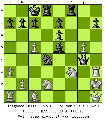 Last move : 0-1 2014 October 19 8:57:11 [Event "FICGS__CHESS__CLASS_D__000211"] [Site "FICGS"] [Date "2014.10.11"] [Round "1"] [White "Trigance,Emile"] [Black "Vollmer,Steve"] [Result "0-1"] [WhiteElo "1573"] [BlackElo "1539"] 1.e4 Nf6 2.e5 Nd5 3.d4 d6 4.c4 Nb6 5.f4 g5 6.exd6 Qxd6 7.c5 Qe6+ 8.Kf2 Nd5 9.fxg5 Nc6 10.Nf3 Bg7 11.Bc4 Qf5 12.Kg1 Be6 13.h3 Nf4 14.Bxe6 fxe6 15.a3 O-O-O 16.g4 Nxh3+ 17.Rxh3 Qxg4+ 18.Kh2 Nxd4 19.Qh1 Rhf8 20.Nbd2 Be5+ 0-1 Alekhine's defense : Four pawns attack, Planinc variation Queenside Castling by player Black (move 15) Player Black won this chess game. Follow this game move after move (download)You sit at the board and suddenly your heart leaps. Your hand trembles to pick up the piece and move it. But what Chess teaches you is that you must sit there calmly and think about whether it's really a good idea and whether there are other better ideas. (Stanley Kubrick) Die Auseinandersetzung mit Karpow war politisch geprägt. Er stand für das kommunistische System, wurde von dessen Repräsentanten gehätschelt. Ich war der Oppositionelle. Jeder Schachweltmeister spiegelt auch die gesellschaftlichen Verhältnisse wider. Kramnik steht für die Börsen-Generation des Neuen Markts, ideologiefrei, zahlenfixiert. (Garry Kasparov) Hay dos clases de hombres: aquellos que se conforman en dejarse llevar por las circunstancias y que juegan barajas y aquellos decididos a controlar las circunstancias y que juegan al Ajedrez. (Mortimer Collins) Soyez une menace à chaque fois que vous vous asseyez pour jouer. (Ken Smith) Live, lose, and learn, by observing your opponent how to win. (Amber Steenbock)