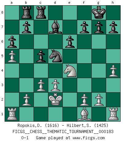 Last move : 0-1 2015 April 1 4:59:33 [Event "FICGS__CHESS__THEMATIC_TOURNAMENT__000183"] [Site "FICGS"] [Date "2014.10.12"] [Round "1"] [White "Ropokis,Dimitrios"] [Black "Hilbert,Stephan J."] [Result "0-1"] [WhiteElo "1616"] [BlackElo "1425"] 1.e4 c5 2.Nf3 a6 3.Nc3 e6 4.a4 d5 5.d3 dxe4 6.Nxe4 Nf6 7.Bg5 Be7 8.Nxf6+ Bxf6 9.Qd2 Bxg5 10.Nxg5 O-O 11.h4 Qb6 12.Qc3 Nc6 13.a5 Qb4 14.Qxb4 Nxb4 15.Kd2 Bd7 16.c3 Nd5 17.Ne4 Rac8 18.Nd6 Rb8 19.Ne4 Rfc8 0-1 This chess game has been lost on time (started : 2014.10.12 0:51:36) Sicilian : O'Kelly variation Kingside Castling by player Black (move 10) Player Black won this chess game. Follow this game move after move (download)The combination player thinks forward; he starts from the given position, and tries the forceful moves in his mind. (Emanuel Lasker) In der Schule lernt man nichts. Es ist nur Zeitverschwendung. (Robert James Fischer) Vive, pierde y aprende al observar a tu oponente como ganar. (Amber Steenbock) L'attaque fait le spectacle, la défense gagne les matchs. (Dicton footballistique) Luck is the residue of design. (John Milton)