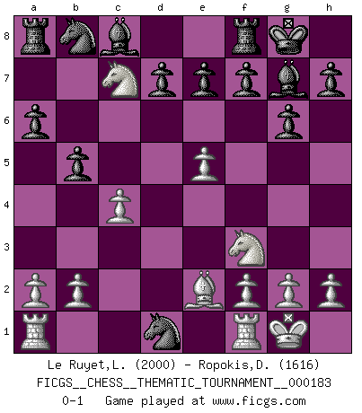 Last move : 0-1 2015 March 25 3:5:8 [Event "FICGS__CHESS__THEMATIC_TOURNAMENT__000183"] [Site "FICGS"] [Date "2014.10.12"] [Round "1"] [White "Le Ruyet,Leopold"] [Black "Ropokis,Dimitrios"] [Result "0-1"] [WhiteElo "2000"] [BlackElo "1616"] 1.e4 c5 2.Nf3 a6 3.c4 g6 4.d4 Bg7 5.dxc5 Qa5+ 6.Bd2 Qxc5 7.Nc3 Nf6 8.Be2 O-O 9.O-O b5 10.Be3 Qc7 11.e5 Ng4 12.Nd5 Nxe3 13.Nxc7 Nxd1 0-1 This chess game has been lost on time (started : 2014.10.12 0:51:36) Sicilian : O'Kelly variation Kingside Castling by player Black (move 8) Kingside Castling by player White (move 9) Player Black won this chess game. Follow this game move after move (download)Why must I lose to this idiot ? (Aron Nimzovich) Mutter, ich bin eben Ex-Weltmeister geworden. --beim nach Hause Kommen nach dem Verlust des WM-Titels an Mihail Botvinnik -- (Mikhail Nekhemyevich Tal) Cuando estes solo, cuando te sientas un extraño en el mundo, juega al Ajedrez. Esto levantará tu espiritu y será tu consejero de guerra. (Aristóteles) Un footballeur joue avec ses pieds, parfois avec sa tête. Un joueur d'échecs ne joue qu'avec sa tête. Et quand il ne joue plus, il meurt. (Jacob Murray) We need strong personalities and only one world champion to attract sponsors. (Anatoly Karpov)