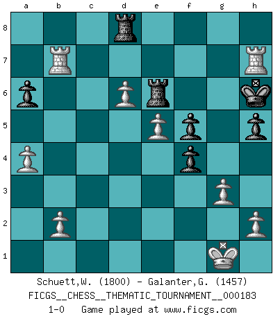 Last move : 1-0 2015 August 23 6:21:2 [Event "FICGS__CHESS__THEMATIC_TOURNAMENT__000183"] [Site "FICGS"] [Date "2014.10.12"] [Round "1"] [White "Schuett,Wilhelm"] [Black "Galanter,Gregory"] [Result "1-0"] [WhiteElo "1800"] [BlackElo "1457"] 1.e4 c5 2.Nf3 a6 3.c4 Nc6 4.d4 cxd4 5.Nxd4 g6 6.Be3 Bg7 7.Qd2 Nf6 8.f3 O-O 9.Nc3 e5 10.Nc2 d6 11.Rd1 Ne8 12.c5 Nd4 13.Nxd4 exd4 14.Bxd4 Bxd4 15.Qxd4 Qf6 16.cxd6 Qxd4 17.Rxd4 Bd7 18.Bc4 Rc8 19.Nd5 Kg7 20.Nb6 Rd8 21.e5 Kg8 22.Bd5 Ng7 23.Rc4 Ne6 24.a4 Rfe8 25.O-O Kg7 26.f4 f5 27.g3 h5 28.Rfc1 Kh6 29.Nxd7 Rxd7 30.Bxe6 Rxe6 31.Rc7 Rd8 32.Rxb7 g5 33.R1c7 gxf4 34.Rh7+ 1-0 Sicilian : O'Kelly variation Kingside Castling by player Black (move 8) Kingside Castling by player White (move 25) Player White won this chess game. Follow this game move after move (download)Combinations have always been the most intriguing aspect of Chess. The masters look for them, the public applauds them, the critics praise them. It is because combinations are possible that Chess is more than a lifeless mathematical exercise. They are the poetry of the game; they are to Chess what melody is to music. They represent the triumph of mind over matter. (Reuben Fine) Dein Körper muss in Topform sein. Dein Schach verfällt, wenn dein Körper verfällt. Der Körper kann nicht vom Geist getrennt werden. (Robert James Fischer) Un juego de Ajedrez es un dialogo, una conversación entre un jugador y su oponente. Cada movimiento del oponente puede contener amenazas o tropiezos, pero un jugador no se puede defender de las amenazas o tomar ventaja de los tropiezos si es que no se pregunta a sí mismo: ¿Que es lo que mi oponente va a hacer después de cada movida?. (Bruce A. Moon) Je ne suis pas le dernier à jouer lâchement des coups douteux pendant le zeïtnot de l'adversaire pour l'achever: en effet les coups qui font le plus peur sont ceux que l'on ne comprend pas. Je me fais souvent peur quand je joue. (Un professeur anonyme) Work expands to fill the time available. (C. Northcote Parkinson, in Parkinson's Laws)