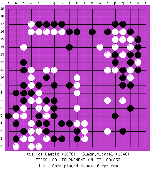 Last move : 1-0 2014 December 9 11:38:46 [Event "FICGS__GO__TOURNAMENT_KYU_II__000053"] [Site "FICGS"] [Date "2014.10.12"] [Round "1"] [Black "Kis-Kos,Laszlo"] [White "Simon,Mickael"] [Result "1-0"] [Rating 1 "1678"] [Rating 2 "1348"] 1.r16 d4 2.q3 d16 3.p17 r10 4.r6 r14 5.r12 p14 6.p12 n14 7.q9 s12 8.s11 r11 9.s13 q12 10.r13 q13 11.s14 r15 12.s15 q16 13.q17 p16 14.o16 p15 15.q11 p11 16.q10 o11 17.q14 q15 18.p13 o13 19.q14 q13 20.m16 o3 21.p5 k4 22.f17 c14 23.k16 d10 24.f3 e3 25.f4 c6 26.h4 k6 27.g7 k8 28.g9 k10 29.d8 c8 30.c9 d9 31.c7 d7 32.b8 e8 33.c8 e6 34.c11 d11 35.b6 c5 36.c12 g11 37.j9 k9 38.k3 l3 39.k2 l2 40.j4 l4 41.h2 h16 42.h17 f16 43.e17 e16 44.j16 g16 45.g17 q7 46.r9 o7 47.f10 f11 48.c3 d2 49.b4 b5 50.a5 c2 51.b2 b1 52.j14 d17 53.f7 e7 54.e9 f5 55.g5 f6 56.g6 f2 57.g2 e1 58.c1 d1 59.e4 d3 60.e5 1-0 Here are the names of the openings (joseki) played in the four corners : Corner d16 : d16 f17 Hoshi (Hwajeom, Seongjeom, Xingwei`) 4-4 Point. The star or hoshi (4-4) point, emphasizing influence at the potential expense of territory. Ikken Kakari (Hankan Keolch'im, Yi Gua`jiao~, 1-Space Low Approach). Black 2 is the standard approach move to the 4-4. Corner d4 : d4 f3 Hoshi (Hwajeom, Seongjeom, Xingwei`) 4-4 Point. The star or hoshi (4-4) point, emphasizing influence at the potential expense of territory. Ikken Kakari (Hankan Keolch'im, Yi Gua`jiao~, 1-Space Low Approach). Black 2 is the standard approach move to the 4-4. Player Black won this Go (weiqi, baduk) game. Follow this game move after move (download)In opponents' sphere of influence, avoid sharp conflict, don't move too deep. (Otake Hideo, 9p) A proverb is a short sentence based on long experience. (Miguel de Cervantes)
