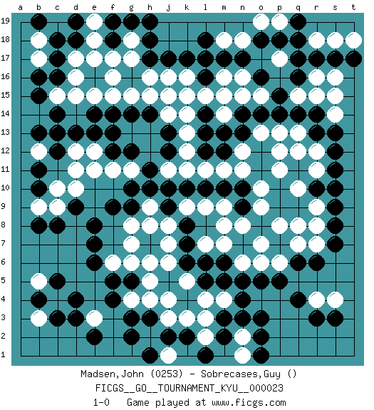 Last move : 1-0 2007 August 16 19:59:37 [Event "FICGS__GO__TOURNAMENT_KYU__000023"] [Site "FICGS"] [Date "2007.02.21"] [Round "1"] [Black "Madsen,John"] [White "Sobrecases,Guy"] [Result "1-0"] [Rating 1 "0253"] 1.d3 g6 2.q16 m7 3.q4 d16 4.c5 d10 5.c14 l4 6.o3 q8 7.g3 j4 8.k10 q10 9.e14 q13 10.h10 d12 11.d13 e11 12.c8 h16 13.c17 e15 14.c16 e17 15.j13 g13 16.f14 f15 17.g14 g15 18.f12 f11 19.g12 g11 20.h11 h13 21.h14 c15 22.b15 d15 23.c13 j15 24.n17 e12 25.e13 h12 26.f13 k11 27.j12 d17 28.e8 g8 29.g9 h9 30.f9 k9 31.l10 l11 32.j10 l9 33.m10 m11 34.k17 o10 35.r6 j8 36.h18 k16 37.l17 m16 38.l16 l15 39.o16 n15 40.r14 k14 41.m3 k3 42.p14 o13 43.r13 q12 44.n5 p6 45.p7 q7 46.q6 o7 47.p5 o6 48.o5 p8 49.s8 r9 50.s9 r7 51.s7 r8 52.s11 r11 53.s10 r12 54.s12 p11 55.d18 e18 56.c18 g17 57.m6 n6 58.l5 k5 59.k6 j6 60.f5 f6 61.e6 g7 62.n9 m9 63.n10 n11 64.k7 l7 65.l6 m4 66.m5 m8 67.n4 l3 68.m2 l2 69.b10 o9 70.o14 p13 71.n14 m14 72.n13 n12 73.g5 h5 74.h3 h4 75.j2 j3 76.k2 g4 77.f4 n2 78.o2 h2 79.g2 n1 80.n3 j11 81.o1 b12 82.c12 d11 83.d9 c10 84.b11 j1 85.h1 s14 86.s13 s15 87.r17 s16 88.s17 s18 89.t17 r15 90.q14 q15 91.p15 g18 92.j17 j16 93.m17 r18 94.q18 p17 95.p18 f17 96.m13 k13 97.l13 k12 98.l14 m15 99.l1 h6 100.e7 n8 101.j9 h8 102.h17 j14 103.k8 j7 104.f19 e19 105.g19 h15 106.g10 c9 107.b8 b9 108.b13 t18 109.q17 k15 110.d19 b3 111.b4 e3 112.e2 c4 113.c3 b5 114.d4 r16 115.pass o19 116.o18 n18 117.pass pass 118.h19 m18 119.l18 p19 120.q19 o15 121.l12 n16 122.m12 p12 123.f18 f16 124.r10 r4 125.r3 s4 126.s3 b17 127.b16 b18 128.b19 1-0 Comment by player 1 : John Madsen : how to end a game after two passes? After the program counts (wrong!), it just offers the opportunity to go back?? Here are the names of the openings (joseki) played in the four corners : Corner d4 : d3 g6 Komoku (Somok, Xiao~mu`) 3-4 Point. The komoku (3-4) point is the traditional corner enclosure move.. Corner q4 : m7 q4 This joseki is unknown. A weak or weird move has probably been played in this corner. Corner d16 : d16 c14 Hoshi (Hwajeom, Seongjeom, Xingwei`) 4-4 Point. The star or hoshi (4-4) point, emphasizing influence at the potential expense of territory. Ikken Kakari (Hankan Keolch'im, Yi Gua`jiao~, 1-Space Low Approach). Black 2 is the standard approach move to the 4-4. Corner q16 : q16 q13 Hoshi (Hwajeom, Seongjeom, Xingwei`) 4-4 Point. The star or hoshi (4-4) point, emphasizing influence at the potential expense of territory. Nikken Takagakari (Dukan Nop'dakeolch'im, E`r Gaojia, 2-Space High Approach). White 2 is a light approach move. Rarely played in even games, White 2 is typically employed in handicap games. Black continues with 6-4 or 3-10. In Korean Sunjang Baduk Black has a stone on 8-4. Player Black won this Go (weiqi, baduk) game. Follow this game move after move (download)The nature of a game comes from what is played, but it's the sensitivity to the possible and the impossible that gives it value. (Pierre Audouard) There is no vagueness without wind. (Chinese proverb)