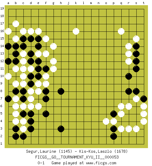 Last move : 0-1 2015 January 11 15:41:22 [Event "FICGS__GO__TOURNAMENT_KYU_II__000053"] [Site "FICGS"] [Date "2014.10.12"] [Round "1"] [Black "Segur,Laurine"] [White "Kis-Kos,Laszlo"] [Result "0-1"] [Rating 1 "1145"] [Rating 2 "1678"] 1.d4 q16 2.q4 d16 3.h3 r6 4.r8 r3 5.r4 q3 6.p3 s3 7.p2 p4 8.s4 q5 9.p5 o4 10.r5 q6 11.s6 t4 12.s5 s7 13.t7 t5 14.s8 t6 15.s11 r13 16.s13 r14 17.s14 r12 18.s12 s15 19.r10 k16 20.c8 c3 21.d3 c4 22.c5 b5 23.c2 c6 24.d5 b7 25.b3 b4 26.b2 d6 27.c7 c10 28.b8 e6 29.a7 b6 30.f8 e8 31.d9 e9 32.d10 c12 33.e10 f9 34.f7 d8 35.h8 f10 36.e12 c9 37.f5 g12 38.d12 c13 39.f11 g11 40.c11 b11 41.b10 d11 42.e11 c11 43.e14 g14 44.d15 e16 45.c15 c16 46.b16 b17 47.d13 f15 48.c14 b9 49.b13 b15 50.e15 f13 51.b12 a10 52.a14 a16 53.b14 e13 54.a12 d7 0-1 Here are the names of the openings (joseki) played in the four corners : Corner q4 : q4 r6 Hoshi (Hwajeom, Seongjeom, Xingwei`) 4-4 Point. The star or hoshi (4-4) point, emphasizing influence at the potential expense of territory. Ikken Kakari (Hankan Keolch'im, Yi Gua`jiao~, 1-Space Low Approach). White 2 is the standard approach move to the 4-4. Corner q16 : q16 s11 Hoshi (Hwajeom, Seongjeom, Xingwei`) 4-4 Point. The star or hoshi (4-4) point, emphasizing influence at the potential expense of territory. Player White won this Go (weiqi, baduk) game. Follow this game move after move (download)Very few good moves are played. (Pierre Audouard) The best teachers teach from the heart, not from the book. (Author unknown)