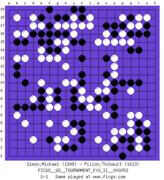 Last move : 0-1 2015 January 14 22:10:42 [Event "FICGS__GO__TOURNAMENT_KYU_II__000053"] [Site "FICGS"] [Date "2014.10.12"] [Round "1"] [Black "Simon,Mickael"] [White "Pillon,Thibault"] [Result "0-1"] [Rating 1 "1348"] [Rating 2 "1613"] 1.r16 d17 2.q3 d3 3.p17 q5 4.r10 o4 5.r5 r6 6.r4 q6 7.p10 l17 8.c15 c13 9.e16 e17 10.f16 g17 11.c10 e13 12.g16 h17 13.h16 e10 14.c7 c5 15.j17 j18 16.f17 f18 17.k18 k17 18.h18 j16 19.g18 j17 20.e18 d18 21.f19 b16 22.b15 c16 23.d16 b18 24.j19 l18 25.k19 h14 26.j15 h15 27.f14 f13 28.k15 m15 29.k13 h12 30.k11 p15 31.n17 n16 32.o16 n15 33.k3 o15 34.q14 q17 35.q16 p16 36.o17 r17 37.s17 s18 38.q18 r18 39.s16 p18 40.f3 f5 41.e7 d8 42.d7 h3 43.k5 g7 44.b12 b13 45.b11 b6 46.b7 j4 47.k4 q4 48.p3 r3 49.s3 r2 50.s2 s5 51.s4 o3 52.o2 n2 53.p1 p4 54.q2 m3 55.j5 h5 56.h2 g2 57.j2 g3 58.o6 n6 59.o7 m7 60.j8 q9 61.q10 k9 62.j9 j10 63.k10 k8 64.k7 l7 65.j7 n9 66.o9 n10 67.n13 h10 68.g8 f7 69.e8 f8 70.g9 e14 71.g14 g13 72.e15 g15 73.f15 f9 74.e9 q15 75.r14 o13 76.n11 o11 77.o10 o12 78.n8 m9 79.m8 l8 0-1 Here are the names of the openings (joseki) played in the four corners : Corner q4 : q3 q5 Komoku (Somok, Xiao~mu`) 3-4 Point. The komoku (3-4) point is the traditional corner enclosure move.. Ikken Takagakari (Hankan Nop'dakeolch'im, Yi Gaogua`jiao~, 1-Space High Approach). The 5-4 approach move has become more popular in modern times, as modern Go emphasizes speed and influence. Corner d16 : d17 c15 Komoku (Somok, Xiao~mu`) 3-4 Point. The komoku (3-4) point is the traditional corner enclosure move.. Ikken Kakari (Hankan Keolch'im, Yi Gua`jiao~, 1-Space Low Pincer). The small knight move is the basic approach move to the 3-4 point stone. It has been continually used for over four centuries. There are limitless variations, with new moves constantly being discovered. Black 2 opens the door to a treaure store of joseki. Corner d4 : d3 c7 Komoku (Somok, Xiao~mu`) 3-4 Point. The komoku (3-4) point is the traditional corner enclosure move.. Player White won this Go (weiqi, baduk) game. Follow this game move after move (download)Don't overlook the edge of the board. (Anonymous) Good decisions come from experience, and experience comes from bad decisions. (Anonymous)