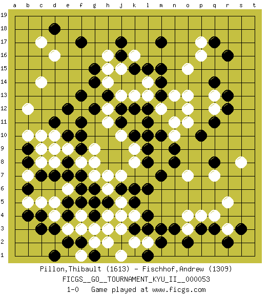 Last move : 1-0 2014 December 27 22:47:21 [Event "FICGS__GO__TOURNAMENT_KYU_II__000053"] [Site "FICGS"] [Date "2014.10.12"] [Round "1"] [Black "Pillon,Thibault"] [White "Fischhof,Andrew"] [Result "1-0"] [Rating 1 "1613"] [Rating 2 "1309"] 1.r16 d16 2.q3 d4 3.f17 c14 4.m17 r5 5.q8 p4 6.p3 o4 7.n3 r3 8.m3 o3 9.o2 q4 10.q11 g3 11.c4 c5 12.d3 e3 13.c3 b5 14.e4 d5 15.e2 f3 16.f2 g2 17.b4 d10 18.f5 f4 19.e5 g5 20.g6 f1 21.d1 p16 22.q14 o15 23.q17 p17 24.j16 o7 25.h5 h4 26.e7 h6 27.g4 j5 28.g5 j3 29.r2 s8 30.m14 o13 31.n12 q13 32.r13 q12 33.r12 o12 34.p10 o11 35.n9 n11 36.j6 h7 37.k5 k4 38.j4 h3 39.k3 j5 40.l4 j4 41.l6 g7 42.f7 k2 43.l3 l2 44.m2 j1 45.l1 h2 46.g1 f8 47.e8 e9 48.c7 e6 49.f6 d8 50.d7 c8 51.b8 c9 52.s3 q7 53.f9 g8 54.b9 b10 55.e10 d9 56.d11 c10 57.f11 b12 58.d18 c17 59.k10 m9 60.n8 m8 61.m7 k8 62.m10 n10 63.l8 k9 64.l9 g9 65.f10 j7 66.k6 j10 67.j11 k11 68.l10 h11 69.j12 h12 70.f13 f12 71.g12 g13 72.e12 j13 73.k12 k13 74.l12 n13 75.g14 h14 76.g15 j15 77.k15 l13 78.m13 m12 79.l11 l14 80.m15 k16 81.l15 h16 82.j17 h15 83.h13 b7 84.b6 1-0 Here are the names of the openings (joseki) played in the four corners : Corner d16 : d16 f17 Hoshi (Hwajeom, Seongjeom, Xingwei`) 4-4 Point. The star or hoshi (4-4) point, emphasizing influence at the potential expense of territory. Ikken Kakari (Hankan Keolch'im, Yi Gua`jiao~, 1-Space Low Approach). Black 2 is the standard approach move to the 4-4. Corner q4 : q3 r5 Komoku (Somok, Xiao~mu`) 3-4 Point. The komoku (3-4) point is the traditional corner enclosure move.. Ikken Kakari (Hankan Keolch'im, Yi Gua`jiao~, 1-Space Low Pincer). The small knight move is the basic approach move to the 3-4 point stone. It has been continually used for over four centuries. There are limitless variations, with new moves constantly being discovered. White 2 opens the door to a treaure store of joseki. Player Black won this Go (weiqi, baduk) game. Follow this game move after move (download)Error is one of the sources of transformation. (Pierre Audouard) Lamb in skin of tiger, still fears the wolf. (Chinese proverb)