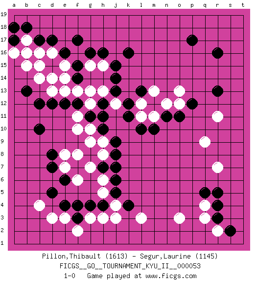Last move : 1-0 2015 January 18 20:0:8 [Event "FICGS__GO__TOURNAMENT_KYU_II__000053"] [Site "FICGS"] [Date "2014.10.12"] [Round "1"] [Black "Pillon,Thibault"] [White "Segur,Laurine"] [Result "1-0"] [Rating 1 "1613"] [Rating 2 "1145"] 1.r16 d3 2.d17 q4 3.d5 c4 4.e4 e3 5.g4 g3 6.f3 f2 7.f4 h3 8.j5 l3 9.c10 r7 10.p17 r11 11.g16 c16 12.c17 c14 13.d15 c15 14.c12 b17 15.b18 b15 16.a17 d13 17.e12 e13 18.k16 g13 19.f12 f13 20.h12 g12 21.g11 f11 22.d12 f10 23.h10 g10 24.h11 f8 25.d8 g7 26.j7 h6 27.j6 h5 28.h4 j4 29.h7 f6 30.k4 j3 31.e6 e7 32.d7 g9 33.r3 q3 34.r4 r2 35.r5 h8 36.j8 h9 37.j9 e8 38.q5 q9 39.s2 o3 40.r13 m13 41.j14 h13 42.j13 j12 43.k12 g15 44.h16 h15 45.j15 f16 46.f17 d16 47.e16 e15 48.f15 d14 49.f14 e14 50.b13 a16 51.a18 b16 52.p12 o13 53.n11 l12 54.k11 l11 55.l10 m11 56.m10 n12 57.o11 o12 58.l13 1-0 Here are the names of the openings (joseki) played in the four corners : Corner d4 : d3 d5 Komoku (Somok, Xiao~mu`) 3-4 Point. The komoku (3-4) point is the traditional corner enclosure move.. Ikken Takagakari (Hankan Nop'dakeolch'im, Yi Gaogua`jiao~, 1-Space High Approach). The 5-4 approach move has become more popular in modern times, as modern Go emphasizes speed and influence. Player Black won this Go (weiqi, baduk) game. Follow this game move after move (download)Dead group ? Always win ko fights ! (Anonymous) I just play for fun. (Anna Kournikova)
