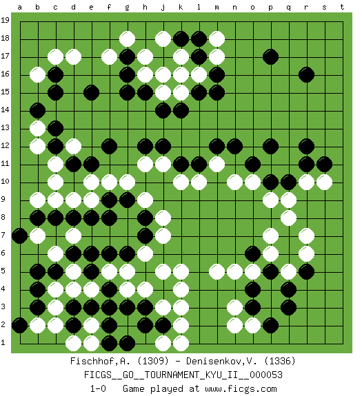 Last move : 1-0 2015 March 3 11:56:19 [Event "FICGS__GO__TOURNAMENT_KYU_II__000053"] [Site "FICGS"] [Date "2014.10.12"] [Round "1"] [Black "Fischhof,Andrew"] [White "Denisenkov,Valentin"] [Result "1-0"] [Rating 1 "1309"] [Rating 2 "1336"] 1.r16 d4 2.q3 d17 3.c15 d12 4.e15 f17 5.g15 h16 6.f12 d9 7.p17 r10 8.r5 k3 9.f3 n3 10.r12 r7 11.l17 f10 12.e11 c10 13.d11 c11 14.c12 b12 15.c13 b13 16.b14 b16 17.c16 c17 18.p12 p6 19.b5 c3 20.d6 f5 21.e5 e4 22.f4 g5 23.d2 c2 24.d3 d5 25.e6 k5 26.b8 b9 27.c8 c9 28.b4 c4 29.h3 h4 30.j4 j3 31.h5 g4 32.g6 h6 33.f6 j5 34.g3 k4 35.j2 k2 36.h2 e2 37.e3 d1 38.f2 e1 39.g1 j1 40.b3 b2 41.a2 k1 42.f1 h9 43.h15 j16 44.l15 o10 45.n12 j11 46.l11 l10 47.k11 k10 48.j12 h11 49.h12 m11 50.m12 j15 51.j14 k17 52.k16 k15 53.k14 l16 54.m16 k16 55.m15 m17 56.l18 m18 57.k18 j18 58.g16 h17 59.g17 g18 60.p10 p9 61.q10 q9 62.o11 n10 63.o4 m5 64.o3 o2 65.p2 n2 66.o6 o5 67.p5 n5 68.q6 p7 69.q7 q8 70.h7 j7 71.h8 j8 72.g9 g10 73.f9 e9 74.f8 e10 75.e8 c6 76.c5 b7 77.a7 d7 78.d8 r6 79.r11 s10 80.s11 q5 81.q4 1-0 This go game has been lost on time (started : 2014.10.12 22:12:25) Here are the names of the openings (joseki) played in the four corners : Corner d16 : d17 c15 Komoku (Somok, Xiao~mu`) 3-4 Point. The komoku (3-4) point is the traditional corner enclosure move.. Ikken Kakari (Hankan Keolch'im, Yi Gua`jiao~, 1-Space Low Pincer). The small knight move is the basic approach move to the 3-4 point stone. It has been continually used for over four centuries. There are limitless variations, with new moves constantly being discovered. Black 2 opens the door to a treaure store of joseki. Player Black won this Go (weiqi, baduk) game. Follow this game move after move (download)When your opponent has two weak groups, attack them both at once. (Anonymous) Life is the sum of all your choices. (Albert Camus)