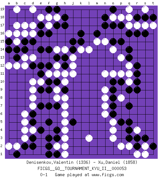 Last move : 0-1 2015 March 5 8:58:11 [Event "FICGS__GO__TOURNAMENT_KYU_II__000053"] [Site "FICGS"] [Date "2014.10.12"] [Round "1"] [Black "Denisenkov,Valentin"] [White "Xu,Daniel"] [Result "0-1"] [Rating 1 "1336"] [Rating 2 "1858"] 1.q16 d4 2.q3 d16 3.r9 o3 4.q5 l3 5.f3 h3 6.f5 c6 7.d2 c3 8.c2 b2 9.j5 o5 10.c14 c12 11.e14 f17 12.b16 c17 13.e11 d10 14.k16 r17 15.r16 q17 16.p17 p18 17.o17 o18 18.n17 q10 19.r10 q11 20.r11 q12 21.r12 n11 22.q13 p13 23.q14 p8 24.n18 s17 25.s16 s19 26.o19 q19 27.r18 q18 28.t18 t17 29.s18 h5 30.d3 c4 31.e4 h6 32.f7 d8 33.f9 e10 34.f10 f11 35.f12 g11 36.e12 h8 37.g4 h4 38.d6 d7 39.d5 c5 40.e7 g12 41.g13 j11 42.h13 j12 43.h17 b17 44.b13 b12 45.d15 g18 46.h18 q2 47.r2 p2 48.q7 r4 49.q4 s2 50.r3 r1 51.s3 j13 52.j14 k14 53.k15 l14 54.o6 n6 55.o7 n7 56.o8 n8 57.o9 n9 58.o10 o11 59.q9 h14 60.j15 g14 61.f14 m15 62.m16 o14 63.p15 b15 64.e16 d17 65.c15 c16 66.b14 g8 67.e9 d9 68.e17 e18 69.f16 g2 70.f2 a16 71.g17 f18 72.b1 a2 73.p5 o4 74.t2 s1 75.p10 p11 76.o15 n15 77.g1 h1 78.f1 d13 79.d12 c13 80.a14 a12 81.a15 b16 82.g19 d19 83.f19 b19 84.g3 h2 85.g7 h7 86.h9 g9 87.g10 h10 88.h12 h11 0-1 Here are the names of the openings (joseki) played in the four corners : Corner d4 : d4 f3 Hoshi (Hwajeom, Seongjeom, Xingwei`) 4-4 Point. The star or hoshi (4-4) point, emphasizing influence at the potential expense of territory. Ikken Kakari (Hankan Keolch'im, Yi Gua`jiao~, 1-Space Low Approach). Black 2 is the standard approach move to the 4-4. Corner d16 : d16 c14 Hoshi (Hwajeom, Seongjeom, Xingwei`) 4-4 Point. The star or hoshi (4-4) point, emphasizing influence at the potential expense of territory. Ikken Kakari (Hankan Keolch'im, Yi Gua`jiao~, 1-Space Low Approach). Black 2 is the standard approach move to the 4-4. Corner q16 : q16 r17 Hoshi (Hwajeom, Seongjeom, Xingwei`) 4-4 Point. The star or hoshi (4-4) point, emphasizing influence at the potential expense of territory. Player White won this Go (weiqi, baduk) game. Follow this game move after move (download)If a formation is symmetrical, play at the center. (Anonymous) Humor is by far the most significant activity of the human brain. (Edward De Bono)