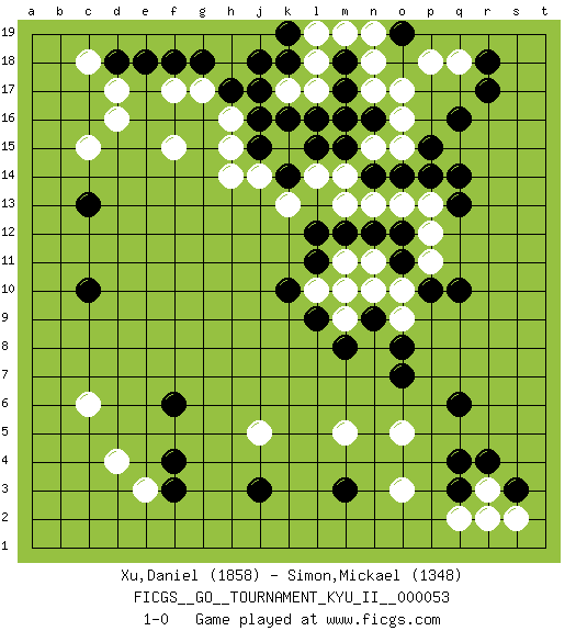 Last move : 1-0 2014 December 16 15:13:1 [Event "FICGS__GO__TOURNAMENT_KYU_II__000053"] [Site "FICGS"] [Date "2014.10.12"] [Round "1"] [Black "Xu,Daniel"] [White "Simon,Mickael"] [Result "1-0"] [Rating 1 "1858"] [Rating 2 "1348"] 1.q16 d4 2.q4 d16 3.q10 o3 4.m3 o5 5.q6 r3 6.q3 q2 7.r4 s2 8.s3 r2 9.o7 m5 10.j3 o17 11.q14 q18 12.r17 l17 13.c10 c6 14.c13 c15 15.d18 d17 16.e18 c18 17.h17 f17 18.f18 g17 19.g18 f15 20.j18 h16 21.j16 h15 22.j15 j14 23.l15 l14 24.m15 h14 25.r18 p18 26.m18 o15 27.o14 n15 28.n14 m14 29.m17 n17 30.p15 m16 31.l16 k15 32.k16 l18 33.n16 o16 34.m16 n18 35.o19 m19 36.k19 l19 37.k18 k17 38.k14 k13 39.j17 n19 40.f3 e3 41.f4 j5 42.f6 o10 43.n12 p13 44.q13 p12 45.o11 p11 46.p10 n13 47.p14 n11 48.o12 o13 49.m12 m11 50.l12 m13 51.l11 m10 52.n9 o9 53.l9 l10 54.k10 m9 55.m8 n10 56.o8 1-0 Here are the names of the openings (joseki) played in the four corners : Corner q4 : q4 o3 Hoshi (Hwajeom, Seongjeom, Xingwei`) 4-4 Point. The star or hoshi (4-4) point, emphasizing influence at the potential expense of territory. Ikken Kakari (Hankan Keolch'im, Yi Gua`jiao~, 1-Space Low Approach). White 2 is the standard approach move to the 4-4. Corner d4 : d4 j3 Hoshi (Hwajeom, Seongjeom, Xingwei`) 4-4 Point. The star or hoshi (4-4) point, emphasizing influence at the potential expense of territory. Corner q16 : q16 o17 Hoshi (Hwajeom, Seongjeom, Xingwei`) 4-4 Point. The star or hoshi (4-4) point, emphasizing influence at the potential expense of territory. Ikken Kakari (Hankan Keolch'im, Yi Gua`jiao~, 1-Space Low Approach). White 2 is the standard approach move to the 4-4. Corner d16 : d16 c13 Hoshi (Hwajeom, Seongjeom, Xingwei`) 4-4 Point. The star or hoshi (4-4) point, emphasizing influence at the potential expense of territory. Niken Kakari (Dukan Keolch'im, E`r Gua`jiao~, 2-Space Low Approach). White typically answers by 7-3 or 3-5 (which is not joseki). Player Black won this Go (weiqi, baduk) game. Follow this game move after move (download)The game plays itself, the players don't control it. (Pierre Audouard) If things go wrong, don't go with them. (Roger Babson)