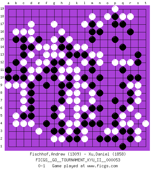 Last move : 0-1 2014 December 3 6:8:55 [Event "FICGS__GO__TOURNAMENT_KYU_II__000053"] [Site "FICGS"] [Date "2014.10.12"] [Round "1"] [Black "Fischhof,Andrew"] [White "Xu,Daniel"] [Result "0-1"] [Rating 1 "1309"] [Rating 2 "1858"] 1.r16 c4 2.q3 d17 3.p17 r9 4.r5 r12 5.k3 e3 6.c15 g17 7.c10 c8 8.e10 d15 9.d14 c16 10.e15 d16 11.c14 q2 12.p2 p3 13.o2 q4 14.r3 o3 15.n2 r4 16.s4 s3 17.r2 s2 18.q1 s5 19.p4 q5 20.p5 r6 21.q6 t4 22.n4 l17 23.d7 c7 24.d6 c6 25.d5 d4 26.c5 b5 27.d8 g4 28.g6 g15 29.p15 p12 30.p7 e14 31.e13 f14 32.m15 n17 33.m16 o18 34.m17 m18 35.r7 h6 36.g5 h5 37.h7 k6 38.h4 j4 39.h3 j3 40.j2 h2 41.g3 g2 42.f4 k4 43.k2 j7 44.h8 j8 45.l4 k5 46.q9 s7 47.r8 s8 48.r10 s9 49.s10 n12 50.q11 q12 51.n10 l12 52.l10 j12 53.j10 k9 54.l8 k10 55.j9 k8 56.l7 k11 57.m12 m13 58.m11 n13 59.l13 l14 60.k13 k14 61.j13 h13 62.j14 j15 63.h14 g14 64.h12 g13 65.g12 q18 66.p18 p19 67.q17 r18 68.s13 b16 69.b15 b9 70.b10 m5 71.l5 l6 72.m6 l3 73.m4 l2 74.h15 h16 75.s12 m7 76.n6 l9 77.m9 m8 78.n8 k7 79.n16 f12 80.f11 e12 81.d12 f13 82.q14 h11 83.g11 h10 84.h9 j11 85.g10 e11 86.f9 d11 87.c11 d10 88.d9 c12 89.b12 d13 90.c13 c9 91.a11 a9 92.a10 b4 0-1 Here are the names of the openings (joseki) played in the four corners : Corner q4 : q3 r9 Komoku (Somok, Xiao~mu`) 3-4 Point. The komoku (3-4) point is the traditional corner enclosure move.. Corner d16 : d17 c15 Komoku (Somok, Xiao~mu`) 3-4 Point. The komoku (3-4) point is the traditional corner enclosure move.. Ikken Kakari (Hankan Keolch'im, Yi Gua`jiao~, 1-Space Low Pincer). The small knight move is the basic approach move to the 3-4 point stone. It has been continually used for over four centuries. There are limitless variations, with new moves constantly being discovered. Black 2 opens the door to a treaure store of joseki. Player White won this Go (weiqi, baduk) game. Follow this game move after move (download)Always remember, keep the balance. [between territory and influence] (Figaro) Art is the only way to run away without leaving home. (Twyla Tharp)