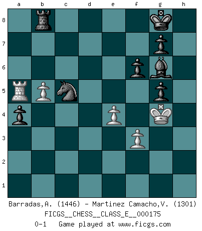 Last move : 0-1 2014 December 12 11:28:43 [Event "FICGS__CHESS__CLASS_E__000175"] [Site "FICGS"] [Date "2014.10.13"] [Round "1"] [White "Barradas,Anderson"] [Black "Martinez Camacho,Victor Hugo"] [Result "0-1"] [WhiteElo "1446"] [BlackElo "1301"] 1.e4 e5 2.Nf3 Nc6 3.Bb5 a6 4.Ba4 b5 5.Bb3 Nf6 6.O-O d6 7.d3 Be7 8.Nc3 Bg4 9.h3 Bh5 10.Bg5 h6 11.Bxf6 Bxf6 12.Nd5 O-O 13.Nxf6+ Qxf6 14.Bd5 Nd4 15.Bxa8 Rxa8 16.g4 Nxf3+ 17.Kg2 Nh4+ 18.Kh1 Bg6 19.f3 Qf4 20.Rf2 Qg3 21.Qg1 Qxh3+ 22.Qh2 Qxh2+ 23.Kxh2 Bh7 24.g5 hxg5 25.Kg3 Ng6 26.b3 Nf4 27.Kg4 f6 28.a4 bxa4 29.Rxa4 Ne6 30.Rc4 a5 31.c3 c5 32.Ra4 Bg6 33.Rfa2 Nf4 34.d4 exd4 35.cxd4 cxd4 36.Rxd4 Ne6 37.Rxd6 Nc5 38.b4 Nb3 39.Ra3 a4 40.b5 Nc5 41.Rc6 Nd7 42.Ra6 Rb8 43.Ra5 Nc5 44.Rc3 Ne6 45.Rc5 Nxc5 0-1 Ruy Lopez : Caro variation Kingside Castling by player White (move 6) Kingside Castling by player Black (move 12) Player Black won this chess game. Follow this game move after move (download)The enormous mental resilience, without which no Chess player can exist, was so much taken up by Chess that he could never free his mind of this game. (Albert Einstein) Mein erstes Ziel war nicht, die Partie zu gewinnen, sondern eine Figur zu opfern. -- der junge (Wilhelm Steinitz) Solo los afeminados hacen el Enroque. (Rob Sillars) Celui qui prend des risques peut perdre, celui qui n'en prend pas perd toujours. (Xavier Tartacover) A good aphorism is too hard for the tooth of time, and is not worn away with the centuries, although it serves as food for every speech. (Friedrich Nietzsche)