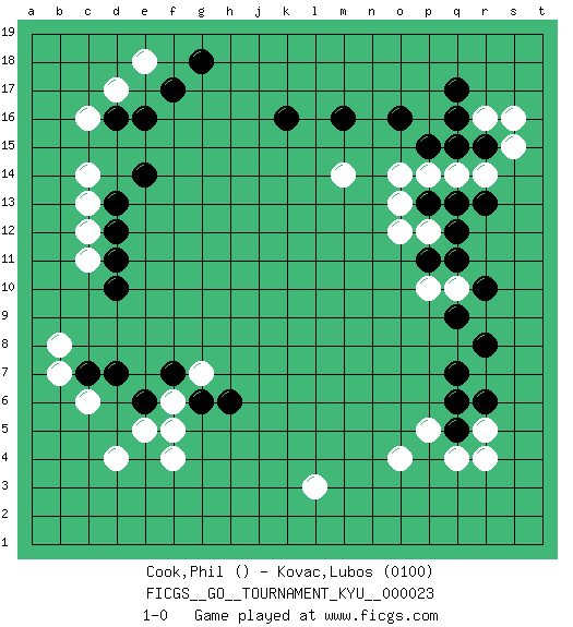 Last move : 1-0 2007 May 15 15:14:58 [Event "FICGS__GO__TOURNAMENT_KYU__000023 "] [Site "FICGS"] [Date "2007.02.21"] [Round "1"] [Black "Cook,Phil "] [White "Kovac,Lubos "] [Result "1-0"] [Rating 2 "0100"] 1.d16 q4 2.q7 d4 3.d7 f4 4.q16 o4 5.k16 c14 6.d13 c13 7.d12 c12 8.d11 c11 9.d10 b8 10.e14 c16 11.e16 d17 12.f17 e18 13.g18 q14 14.q12 o14 15.o16 m14 16.m16 q10 17.r10 p12 18.q11 l3 19.q9 p10 20.q5 r5 21.r6 r4 22.r8 p5 23.q6 c6 24.c7 b7 25.p15 p14 26.p13 o13 27.q13 o12 28.p11 r14 29.r13 r16 30.r15 s15 31.q15 s16 32.q17 g7 33.f7 f6 34.e6 e5 35.g6 f5 36.h6 1-0 This go game has been lost on time (started : 2007.02.21 18:12:29) Here are the names of the openings (joseki) played in the four corners : Corner q4 : q4 q7Hoshi (Hwajeom, Seongjeom, Xingwei`) 4-4 Point. The star or hoshi (4-4) point, emphasizing influence at the potential expense of territory.Nikken Takagakari (Dukan Nop'dakeolch'im, E`r Gaojia, 2-Space High Approach). Black 2 is a light approach move. Rarely played in even games, Black 2 is typically employed in handicap games. White continues with 6-4 or 3-10. In Korean Sunjang Baduk White has a stone on 8-4. Corner d4 : d4 d7Hoshi (Hwajeom, Seongjeom, Xingwei`) 4-4 Point. The star or hoshi (4-4) point, emphasizing influence at the potential expense of territory.Nikken Takagakari (Dukan Nop'dakeolch'im, E`r Gaojia, 2-Space High Approach). Black 2 is a light approach move. Rarely played in even games, Black 2 is typically employed in handicap games. White continues with 6-4 or 3-10. In Korean Sunjang Baduk White has a stone on 8-4. Corner d16 : d16 c14Hoshi (Hwajeom, Seongjeom, Xingwei`) 4-4 Point. The star or hoshi (4-4) point, emphasizing influence at the potential expense of territory.Ikken Kakari (Hankan Keolch'im, Yi Gua`jiao~, 1-Space Low Approach). White 2 is the standard approach move to the 4-4. Corner q16 : q16 q14Hoshi (Hwajeom, Seongjeom, Xingwei`) 4-4 Point. The star or hoshi (4-4) point, emphasizing influence at the potential expense of territory.Ikken Takagakari (Hankan Nop'dakeolch'im, Yi Gaojia, 1-Space High Approach). Black typically responds at 6-4 or 3-10. Black 4-10 is played when Black finds play on the right side advantageous. Black 4-8 or 3-8 may be played when Black has support at top. Player Black won this Go (weiqi, baduk) game.Follow this game move after move (download ) In the opening, when you don't know what to play, make a shimari. (Jansteen) To be champion requires more than simply being a strong player; one has to be a strong human being as well. (Anatoly Karpov)