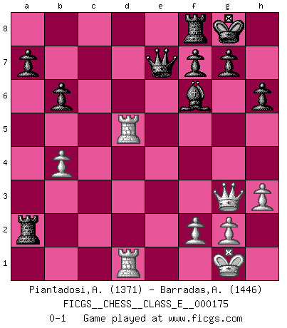 Last move : 0-1 2014 November 27 1:27:50 [Event "FICGS__CHESS__CLASS_E__000175"] [Site "FICGS"] [Date "2014.10.13"] [Round "1"] [White "Piantadosi,Angelo"] [Black "Barradas,Anderson"] [Result "0-1"] [WhiteElo "1371"] [BlackElo "1446"] 1.e4 e5 2.Nf3 Nc6 3.d4 exd4 4.Nxd4 Nxd4 5.Qxd4 b6 6.Be2 Nf6 7.Nc3 Bc5 8.Qc4 O-O 9.O-O c6 10.b4 d5 11.exd5 cxd5 12.Qh4 Be7 13.Bg5 h6 14.Bxf6 Bxf6 15.Qg3 Bb7 16.Rad1 Rc8 17.Bf3 Rxc3 18.Rd3 Rxc2 19.Rfd1 Rxa2 20.h3 Ba8 21.Bxd5 Bxd5 22.Rxd5 Qe7 0-1 Scotch game Kingside Castling by player Black (move 8) Kingside Castling by player White (move 9) Player Black won this chess game. Follow this game move after move (download)I feel as if I were a piece in a game of Chess, when my opponent says of it: That piece cannot be moved. (Soren Kierkegaard) Wenn du auf das Glück wartest, wird das Leben ziemlich langweilig. (Mikhail Nekhemyevich Tal) Juega la Apertura como un libro, el Juego Medio como un mago y los Finales como una máquina. (Spielmann) Pour moi, les échecs ne sont pas un jeu mais un art. (Alexandre Alekhine) He who fights with monsters should be careful lest he thereby become a monster. (Friedrich Nietzsche, Beyond Good and Evil)