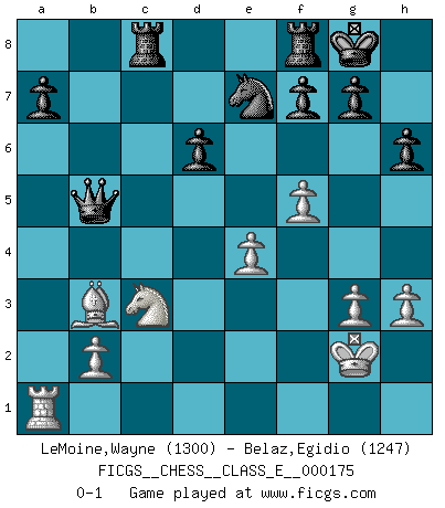 Last move : 0-1 2015 February 27 23:42:22 [Event "FICGS__CHESS__CLASS_E__000175"] [Site "FICGS"] [Date "2014.10.13"] [Round "1"] [White "LeMoine,Wayne"] [Black "Belaz,Egidio"] [Result "0-1"] [WhiteElo "1300"] [BlackElo "1247"] 1.e4 e5 2.Nf3 Nc6 3.Nc3 Nf6 4.Bb5 Bd6 5.d4 exd4 6.Nxd4 O-O 7.Bg5 Ne5 8.O-O c6 9.Ba4 b5 10.Bb3 Ba6 11.Bxf6 Qxf6 12.h3 b4 13.Na4 Bxf1 14.Kxf1 c5 15.Nb5 Be7 16.Nc7 Rab8 17.Nd5 Qg5 18.Nxe7+ Qxe7 19.Qd5 d6 20.a3 h6 21.f4 Ng6 22.g3 Rbe8 23.Kg2 Qc7 24.axb4 cxb4 25.f5 Ne7 26.Qc4 Qb7 27.c3 bxc3 28.Nxc3 Rc8 29.Qb5 Qxb5 0-1 This chess game has been lost on time (started : 2014.10.13 2:45:7) Four knights : Spanish variation Kingside Castling by player Black (move 6) Kingside Castling by player White (move 8) Player Black won this chess game. Follow this game move after move (download)Chess is a forcing house where the fruits of character can ripen more fully than in life. (Edward Morgan Foster) Du weisst es gibt ein Problem mit Computern und Fernschach, wenn jeder eine Rating von 2450 hat. (John Christen Knudsen) La única cosa que los jugadores de Ajedrez tienen en común, es el Ajedrez. (Lodewijk Prins) Avant la finale, les dieux ont créé le milieu de partie. (Tarrasch) There is a great deal of difference between an eager man who wants to read a book and a tired man who wants a book to read. (G.K. Chesterton)
