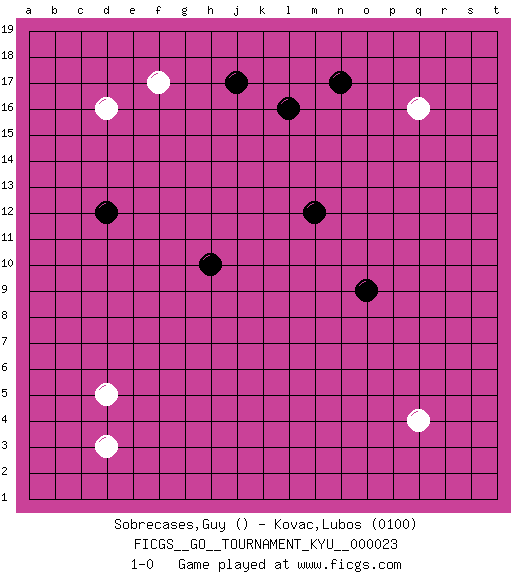 Last move : 1-0 2007 April 29 1:5:6 [Event "FICGS__GO__TOURNAMENT_KYU__000023"] [Site "FICGS"] [Date "2007.02.21"] [Round "1"] [Black "Sobrecases,Guy"] [White "Kovac,Lubos"] [Result "1-0"] [Rating 2 "0100"] 1.h10 q4 2.o9 d5 3.m12 d16 4.l16 d3 5.d12 f17 6.j17 q16 7.n17 1-0 This go game has been lost on time (started : 2007.02.21 18:12:29) Here are the names of the openings (joseki) played in the four corners : Corner q4 : q4 o9 Hoshi (Hwajeom, Seongjeom, Xingwei`) 4-4 Point. The star or hoshi (4-4) point, emphasizing influence at the potential expense of territory. Corner d16 : d16 d12 Hoshi (Hwajeom, Seongjeom, Xingwei`) 4-4 Point. The star or hoshi (4-4) point, emphasizing influence at the potential expense of territory. Player Black won this Go (weiqi, baduk) game. Follow this game move after move (download)If you cannot succeed, then die gloriously. (Chinese proverb) Now the reason the enlightened prince and the wise general conquer the enemy whenever they move and their achievements surpass those of ordinary men is foreknowledge. (Sun Tzu)