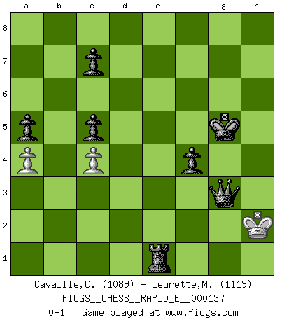 Last move : 0-1 2014 October 26 15:22:50 [Event "FICGS__CHESS__RAPID_E__000137"] [Site "FICGS"] [Date "2014.10.13"] [Round "1"] [White "Cavaille,Cedric"] [Black "Leurette,Marc-Antoine"] [Result "0-1"] [WhiteElo "1089"] [BlackElo "1119"] 1.e4 e5 2.Nf3 Nc6 3.Bb5 Nf6 4.Bxc6 bxc6 5.d3 d5 6.Qe2 Bd6 7.Bg5 h6 8.Bxf6 Qxf6 9.b3 d4 10.c4 Bb4+ 11.Nbd2 Bc3 12.Rc1 c5 13.O-O Bg4 14.Rfd1 O-O 15.h3 Bxf3 16.Qxf3 Qxf3 17.Nxf3 Rfe8 18.Nd2 a5 19.a4 g5 20.g4 Kg7 21.Nb1 Bb4 22.Kg2 Kg6 23.Nd2 Rh8 24.Rc2 f6 25.Kg3 h5 26.gxh5+ Rxh5 27.Nf3 Rah8 28.Rh1 g4 29.Nxe5+ fxe5 30.R2c1 gxh3 31.Rh2 Bd2 32.Rch1 Bf4+ 33.Kg4 Bxh2 34.Rxh2 Rh4+ 35.Kg3 Kh5 36.Rxh3 Rxh3+ 37.Kxh3 Rb8 38.Kg3 Rxb3 39.f4 Rxd3+ 40.Kf2 exf4 41.e5 Re3 42.e6 Kg5 43.e7 Rxe7 44.Kf3 Re3+ 45.Kg2 d3 46.Kf2 d2 47.Kf1 d1Q+ 48.Kg2 Qf3+ 49.Kg1 Re1+ 50.Kh2 Qg3+ 0-1 Ruy Lopez : Berlin defense Kingside Castling by player White (move 13) Kingside Castling by player Black (move 14) 10 pieces endgame at move 43 : White KPP , Black KRPPPPP WHITE : King + 2 Pawns BLACK : King + 1 Rook 5 Pawns Promotion Queen by player Black (move 47) Player Black won this chess game. Follow this game move after move (download)If one piece is badly posted, the whole game is bad. (Tarrasch) Früher wurde jeder komplizierte Zug, jedes interessante Opfer mit großem Beifall und Enthusiasmus aufgenommen. Heute schaltet man einfach seinen Fritz an, und man kann sehen, was los ist, ob der Zug geht oder nicht. (Vladimir Kramnik) Uno por uno, yo los acribillé, mi superioridad muy pronto se volvio aparente. (Jose Capablanca) 'L'échange des dames est un coup dur pour les deux adversaires...' Un journaliste lors d'une partie du match Spassky-Fischer Follow your passion, and success will follow you. (Arthur Buddhold)