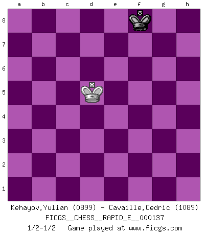 Last move : 1/2-1/2 2014 November 4 22:9:37 [Event "FICGS__CHESS__RAPID_E__000137"] [Site "FICGS"] [Date "2014.10.13"] [Round "1"] [White "Kehayov,Yulian"] [Black "Cavaille,Cedric"] [Result "1/2-1/2"] [WhiteElo "0899"] [BlackElo "1089"] 1.e4 c5 2.Nf3 e6 3.d4 Nf6 4.dxc5 Bxc5 5.Be2 Ng4 6.h3 Nxf2 7.Qd2 Nxh1 8.Nc3 Ng3 9.Qf4 Nxe2 10.Nxe2 O-O 11.Bd2 Nc6 12.a3 b5 13.O-O-O a5 14.Nc3 b4 15.Na4 Bb6 16.Nxb6 Qxb6 17.a4 Nd4 18.Nxd4 Qxd4 19.Bc3 Qc4 20.Be5 Bb7 21.b3 Qc6 22.Qg3 f6 23.Bf4 h6 24.Bxh6 Rf7 25.Re1 Rc8 26.Re2 g5 27.h4 Qc3 28.Qxc3 Rxc3 29.hxg5 Kh7 30.e5 fxg5 31.Bxg5 Rg7 32.Bd2 Rcg3 33.Kb2 Rxg2 34.Rxg2 Rxg2 35.Be3 Be4 36.Bb6 Rxc2+ 37.Ka1 Kg6 38.Bxa5 Rc5 39.Bxb4 Rxe5 40.Kb2 Bd5 41.Bd6 Re2+ 42.Ka3 e5 43.b4 Re3+ 44.Kb2 Bc4 45.b5 Rd3 46.Bxe5 Rd5 47.Bc3 Bxb5 48.axb5 Rxb5+ 49.Kc2 Kf5 50.Kd3 d5 51.Ba1 Ra5 52.Bh8 Ra3+ 53.Kd4 Ke6 54.Bg7 Kf7 55.Bh8 Ke6 56.Bg7 Kd6 57.Bf8+ Kc6 58.Bxa3 Kd7 59.Kxd5 Ke8 60.Bf8 Kxf8 1/2-1/2 Sicilian defense Kingside Castling by player Black (move 10) Queenside Castling by player White (move 13) 10 pieces endgame at move 39 : White KBPPP , Black KRBPP WHITE : King + 1 Bishop 3 Pawns BLACK : King + 1 Rook 1 Bishop 2 Pawns 9 pieces endgame at move 39 : White KBPP , Black KRBPP WHITE : King + 1 Bishop 2 Pawns BLACK : King + 1 Rook 1 Bishop 2 Pawns 8 pieces endgame at move 46 : White KBPP , Black KRBP WHITE : King + 1 Bishop 2 Pawns BLACK : King + 1 Rook 1 Bishop 1 Pawn 7 pieces endgame at move 47 : White KBP , Black KRBP WHITE : King + 1 Bishop 1 Pawn BLACK : King + 1 Rook 1 Bishop 1 Pawn 6 pieces endgame at move 48 : White KBP , Black KRP WHITE : King + 1 Bishop 1 Pawn BLACK : King + 1 Rook 1 Pawn 5 pieces endgame at move 48 : White KB , Black KRP WHITE : King + 1 Bishop BLACK : King + 1 Rook 1 Pawn 4 pieces endgame at move 58 : White KB , Black KP WHITE : King + 1 Bishop BLACK : King + 1 Pawn 3 pieces endgame at move 59 : White KB , Black K WHITE : King + 1 Bishop BLACK : King + 2 pieces endgame at move 60 : White K , Black K WHITE : King + BLACK : King + This chess game ended in a draw. Follow this game move after move (download)It's always better to sacrifice your opponent's men. (Savielly Tartakover) Du musst Deinen Gegner in einen tiefen dunklen Wald führen wo 2+2=5 ist und wo der Weg, der wieder hinausführt, nur breit genug für einen ist. (Mikhail Nekhemyevich Tal) Sin errores no puede haber brillantez. (Emanuel Lasker) Mais l'homme est une créature légère et illogique : semblable au joueur d'échecs, il n'aime que le processus du but à atteindre, non le but lui-même. (Dostoïevsky) A specialist learns more and more about less and less until he knows everything about nothing. (Nicholas Murray Butler)