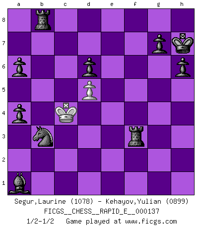 Last move : 1/2-1/2 2014 November 16 21:11:27 [Event "FICGS__CHESS__RAPID_E__000137"] [Site "FICGS"] [Date "2014.10.13"] [Round "1"] [White "Segur,Laurine"] [Black "Kehayov,Yulian"] [Result "1/2-1/2"] [WhiteElo "1078"] [BlackElo "0899"] 1.d4 d6 2.e3 Bd7 3.Nf3 Nf6 4.Bd3 e5 5.O-O Be7 6.Nc3 O-O 7.Ne4 Nxe4 8.Bxe4 Nc6 9.c3 Qc8 10.b4 Nd8 11.a4 c6 12.b5 cxb5 13.Bd3 bxa4 14.c4 a6 15.d5 b5 16.Qc2 bxc4 17.Bxc4 h6 18.Bb2 Nb7 19.h3 Na5 20.Ba2 Qxc2 21.Bc1 Bf6 22.g4 e4 23.Nd2 Bxa1 24.f3 exf3 25.Rxf3 Qxc1+ 26.Nf1 Rfe8 27.Rf4 Red8 28.e4 Qc5+ 29.Kg2 Qc2+ 30.Rf2 Qxe4+ 31.Rf3 Qe2+ 32.Rf2 Qxf2+ 33.Kxf2 f5 34.Ne3 fxg4 35.hxg4 Rf8+ 36.Nf5 Bxf5 37.gxf5 Rxf5+ 38.Ke3 Re8+ 39.Kd3 Nb3 40.Bb1 Rf3+ 41.Kc4 Rb8 42.Bh7+ Kxh7 1/2-1/2 Queen's Pawn Kingside Castling by player White (move 5) Kingside Castling by player Black (move 6) This chess game ended in a draw. Follow this game move after move (download)Openings teach you openings. Endgames teach you chess ! (Stephan Gerzadowicz) Ein Teil des Fehlers ist immer korrekt. (Savielly Grigorievitsch Tartakower) Dejen al perfeccionista jugar por correo. (Yasser Seirawan) La victoire dans une partie d'Echecs appartient la plupart du temps à celui qui voit un peu plus loin que l'adversaire. (Lasker) Remember : Your focus determines your reality. (Qui-Gon Jinn in Star Wars ep.1)