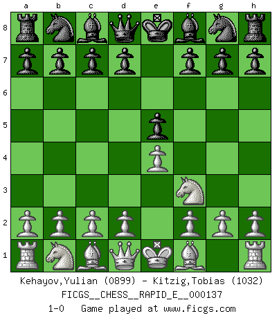 Last move : 1-0 2014 November 24 23:40:8 [Event "FICGS__CHESS__RAPID_E__000137"] [Site "FICGS"] [Date "2014.10.13"] [Round "1"] [White "Kehayov,Yulian"] [Black "Kitzig,Tobias"] [Result "1-0"] [WhiteElo "0899"] [BlackElo "1032"] 1.e4 e5 2.Nf3 1-0 This chess game has been lost on time (started : 2014.10.13 10:9:37) King's knight Opening Player White won this chess game. Follow this game move after move (download)Chess is 99 percent tactics. (Teichmann) Nie in meinem Leben habe ich die französische Verteidigung gespielt, welche die Stumpfsinnigste von allen ist. (Wilhelm Steinitz) El Ajedrez es un juego terrible. Si no dominas el centro, tu oponente tiene una posición mas libre. Si tu tienes el centro, entonces realmente tienes algo de que preocuparte. (Siegbert Tarrasch) Je menace de comprendre la position. (Anonyme) Do you know these so called Volunteers don't even get paid! (Simpsons)