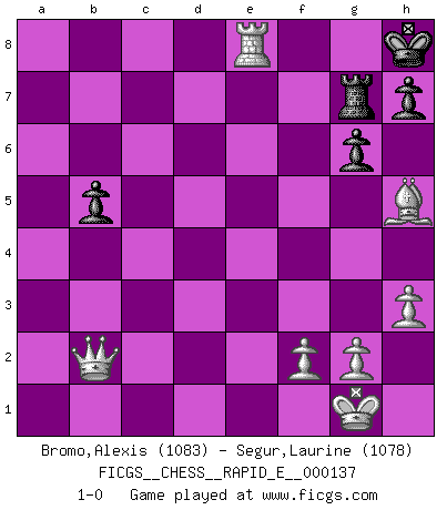 Last move : 1-0 2014 November 24 19:17:3 [Event "FICGS__CHESS__RAPID_E__000137"] [Site "FICGS"] [Date "2014.10.13"] [Round "1"] [White "Bromo,Alexis"] [Black "Segur,Laurine"] [Result "1-0"] [WhiteElo "1083"] [BlackElo "1078"] 1.d4 d5 2.c4 Nf6 3.Nc3 e6 4.a3 Bd6 5.Nf3 O-O 6.e3 Nc6 7.b3 b6 8.h3 a6 9.cxd5 Ne7 10.e4 Rb8 11.Bg5 Nh5 12.Bxe7 Bxe7 13.Be2 exd5 14.Nxd5 Bd6 15.e5 c6 16.Ne3 Be7 17.b4 c5 18.bxc5 bxc5 19.Rb1 f6 20.Rxb8 cxd4 21.Nxd4 fxe5 22.Bxh5 exd4 23.Qb3+ Kh8 24.Nd5 Be6 25.Rxd8 Rxd8 26.Qb7 Bxa3 27.Nf4 Rc8 28.O-O Bf5 29.Re1 Rf8 30.Ne6 Rg8 31.Nxd4 Bd3 32.Qb3 Bb5 33.Qxa3 g6 34.Nxb5 axb5 35.Qb2+ Rg7 36.Re8+ 1-0 QGD : Marshall defense Kingside Castling by player Black (move 5) Kingside Castling by player White (move 28) Player White won this chess game. Follow this game move after move (download)All Chess players should have a hobby. (Savielly Tartakower) Schach ist wie eine schöne Frau, zu der wir ständig zurückkehren, gleichviel, wie oft sie uns zurückweist. (Anonymous) Bobby solo arroja las piezas y solas caen en las casillas correctas. (Miguel Najdorf ) Mais n'est-ce pas déjà le limiter injurieusement que d'appeler les échecs un jeu? N'est-ce pas aussi une science, un art, ou quelque chose qui, comme le cercueil de Mahomet entre ciel et terre, est suspendu entre l'un et l'autre, et qui réunit un nombre incroyable de contraires ? (Stefan Zweig) Political correctness is subjecting us to gross incompetence. (Johann Piek)