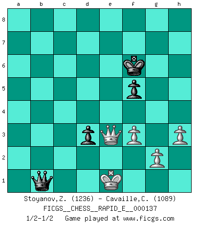 Last move : 1/2-1/2 2014 October 28 20:44:54 [Event "FICGS__CHESS__RAPID_E__000137"] [Site "FICGS"] [Date "2014.10.13"] [Round "1"] [White "Stoyanov,Zdravko"] [Black "Cavaille,Cedric"] [Result "1/2-1/2"] [WhiteElo "1236"] [BlackElo "1089"] 1.e4 e5 2.Nf3 d6 3.h3 Nc6 4.Bb5 Bd7 5.d3 h6 6.O-O Nf6 7.Re1 Be7 8.Nc3 O-O 9.Be3 a6 10.Bc4 b5 11.Bd5 Nxd5 12.Nxd5 Bf6 13.Qc1 Be6 14.Nxf6+ Qxf6 15.Nh2 Nd4 16.Bxd4 exd4 17.Qd1 c5 18.a3 a5 19.b3 b4 20.axb4 axb4 21.Ra4 Rxa4 22.bxa4 Qd8 23.Qh5 Qa5 24.Ra1 Bd7 25.Ng4 Ra8 26.Nxh6+ gxh6 27.Qxh6 Bxa4 28.Qxd6 Qd8 29.Qxc5 Bxc2 30.Rxa8 Qxa8 31.Qxc2 Qa3 32.Qc5 Qxd3 33.Qxb4 Qxe4 34.Kf1 Kg7 35.Kg1 Kg6 36.Qd6+ f6 37.Qg3+ Kf5 38.Kf1 d3 39.Qe3 Ke5 40.Ke1 f5 41.Kd2 Kf6 42.f3 Qb4+ 43.Kd1 Qb3+ 44.Ke1 Qb1+ 45.Kd2 Qc2+ 46.Ke1 Qb1+ 47.Kd2 Qc2+ 48.Ke1 Qb1+ 1/2-1/2 Philidor's defense Kingside Castling by player White (move 6) Kingside Castling by player Black (move 8) 10 pieces endgame at move 33 : White KQPPPP , Black KQPP WHITE : King + 1 Queen 4 Pawns BLACK : King + 1 Queen 2 Pawns 9 pieces endgame at move 33 : White KQPPP , Black KQPP WHITE : King + 1 Queen 3 Pawns BLACK : King + 1 Queen 2 Pawns This chess game ended in a draw. Follow this game move after move (download)Help your pieces so they can help you. (Paul Morphy) Je mehr ich von der FIDE weiss, um so weniger verstehe ich. (Alexander Kalifman) De eso se trata el Ajedrez. Un día le das una lección a tu oponente y al día siguiente el te da una a tí. (Bobby Fischer) Le plus grand jeu de l'esprit jamais inventé, plus vous l'apprenez, plus vous y prenez du plaisir. (Garry Kasparov) Every now and then a man's mind is stretched by a new idea and never shrinks back to its former dimensions. (Oliver Wendell Holmes, Sr.)