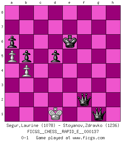 Last move : 0-1 2015 January 13 19:34:41 [Event "FICGS__CHESS__RAPID_E__000137"] [Site "FICGS"] [Date "2014.10.13"] [Round "1"] [White "Segur,Laurine"] [Black "Stoyanov,Zdravko"] [Result "0-1"] [WhiteElo "1078"] [BlackElo "1236"] 1.d4 d5 2.Nf3 Nc6 3.e3 a6 4.Nbd2 e6 5.Bd3 Bd6 6.c3 Nf6 7.O-O O-O 8.Re1 Ng4 9.b4 b5 10.Qc2 Nf6 11.a3 Ne7 12.a4 Bd7 13.Ng5 g6 14.Ndf3 Nf5 15.a5 h6 16.Nh3 c6 17.Nf4 Bxf4 18.exf4 Nh5 19.Ne5 Nf6 20.Qe2 h5 21.Qf3 Nh4 22.Qd1 Nf5 23.Qb3 Nd6 24.f3 Bc8 25.Nxc6 Qc7 26.Ne5 Kg7 27.Bb2 Kg8 28.Rac1 Kg7 29.Qc2 Nf5 30.g3 Rh8 31.Kg2 Nd7 32.Nxd7 Bxd7 33.g4 hxg4 34.fxg4 Nh6 35.h3 Qxf4 36.Rf1 Qe3 37.Rf3 Qg5 38.Re1 Nxg4 39.hxg4 Qxg4+ 40.Kf2 Rh2+ 41.Ke3 Rxc2 42.Bxc2 Rh8 43.Ref1 f5 44.Rf4 Rh3+ 45.R4f3 f4+ 46.Ke2 Rh2+ 47.R1f2 Rxf2+ 48.Kxf2 Kf6 49.Bb3 Bc6 50.Bc1 e5 51.dxe5+ Kxe5 52.Rxf4 Qh5 53.Rf7 Qh2+ 54.Ke1 Qg3+ 55.Kd1 Qd3+ 56.Ke1 Qxc3+ 57.Bd2 Qxb3 58.Re7+ Kd6 59.Ra7 Qb1+ 60.Ke2 Qe4+ 61.Kd1 Qg4+ 62.Kc2 Qc8 63.Kc3 Bb7 64.Kb3 Qb8 65.Rxb7 Qxb7 66.Bf4+ Ke6 67.Kc3 Qc6+ 68.Kd3 Qc4+ 69.Ke3 Qe4+ 70.Kf2 Qxf4+ 71.Ke2 g5 72.Ke1 g4 73.Ke2 g3 74.Kd1 Qf2 75.Kc1 g2 76.Kd1 g1Q+ 0-1 Queen's pawn game, Chigorin variation Kingside Castling by player White (move 7) Kingside Castling by player Black (move 7) 10 pieces endgame at move 65 : White KBPP , Black KQPPPP WHITE : King + 1 Bishop 2 Pawns BLACK : King + 1 Queen 4 Pawns 9 pieces endgame at move 70 : White KPP , Black KQPPPP WHITE : King + 2 Pawns BLACK : King + 1 Queen 4 Pawns Promotion Queen by player Black (move 76) Player Black won this chess game. Follow this game move after move (download)I prefer to lose a really good game than to win a bad one. (David Levy) Moralische Siege zählen nicht. (Savielly Grigorievitsch Tartakower) Desconfianza es la característica mas necesaria de un jugador de Ajedrez. (Siegbert Tarrasch) Il a essayé de se convaincre qu'il pourrait empêcher toutes les erreurs et ne jamais perdre. L'horreur ! Gary Kasparov au sujet de Robert Fischer. The difference between perseverance and obstinacy is that one comes from a strong will, and the other from a strong won't. (Henry Ward Beecher)